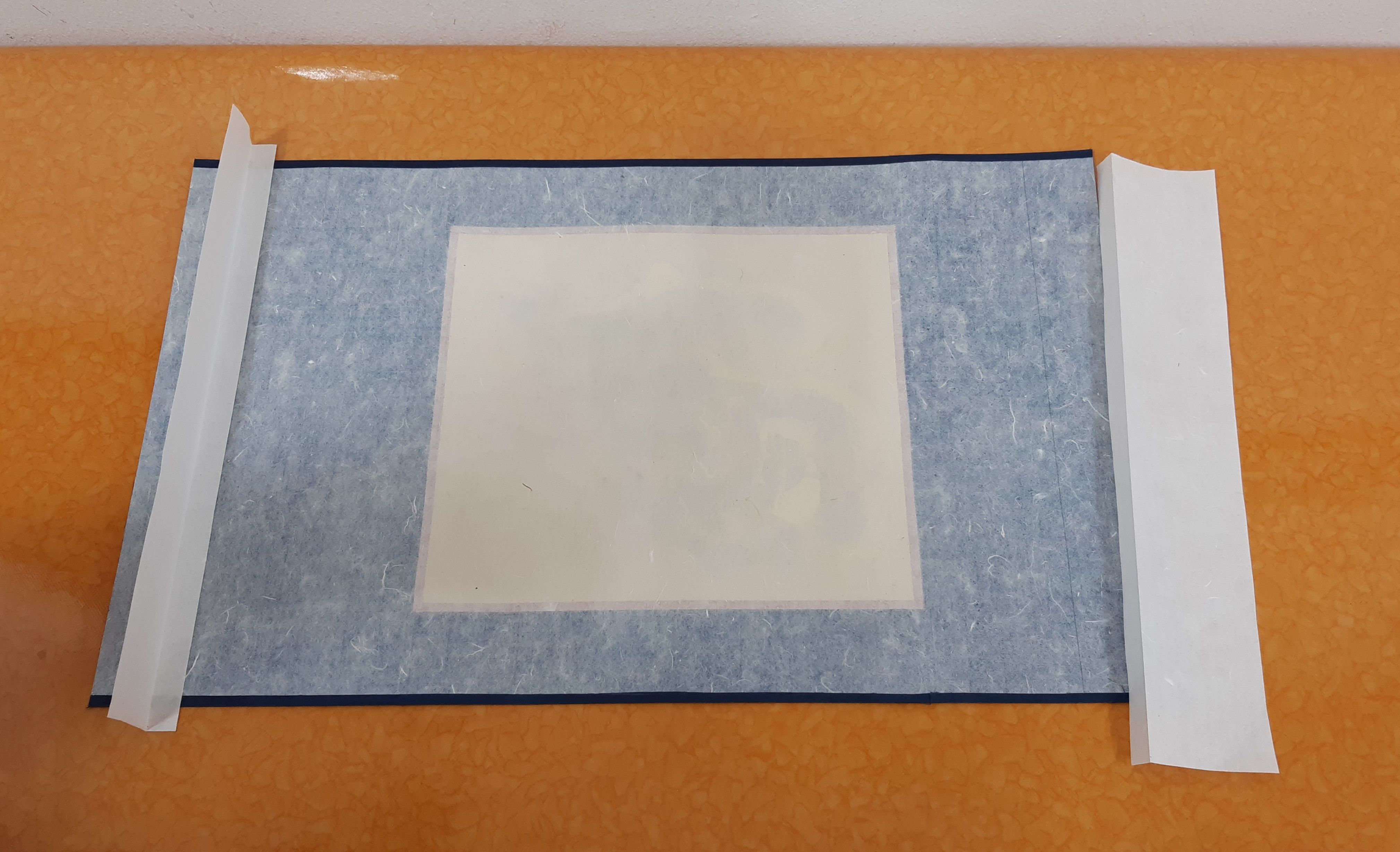 1.5cm 부분을 접어 반만 풀칠하여 족자에 붙입니다.