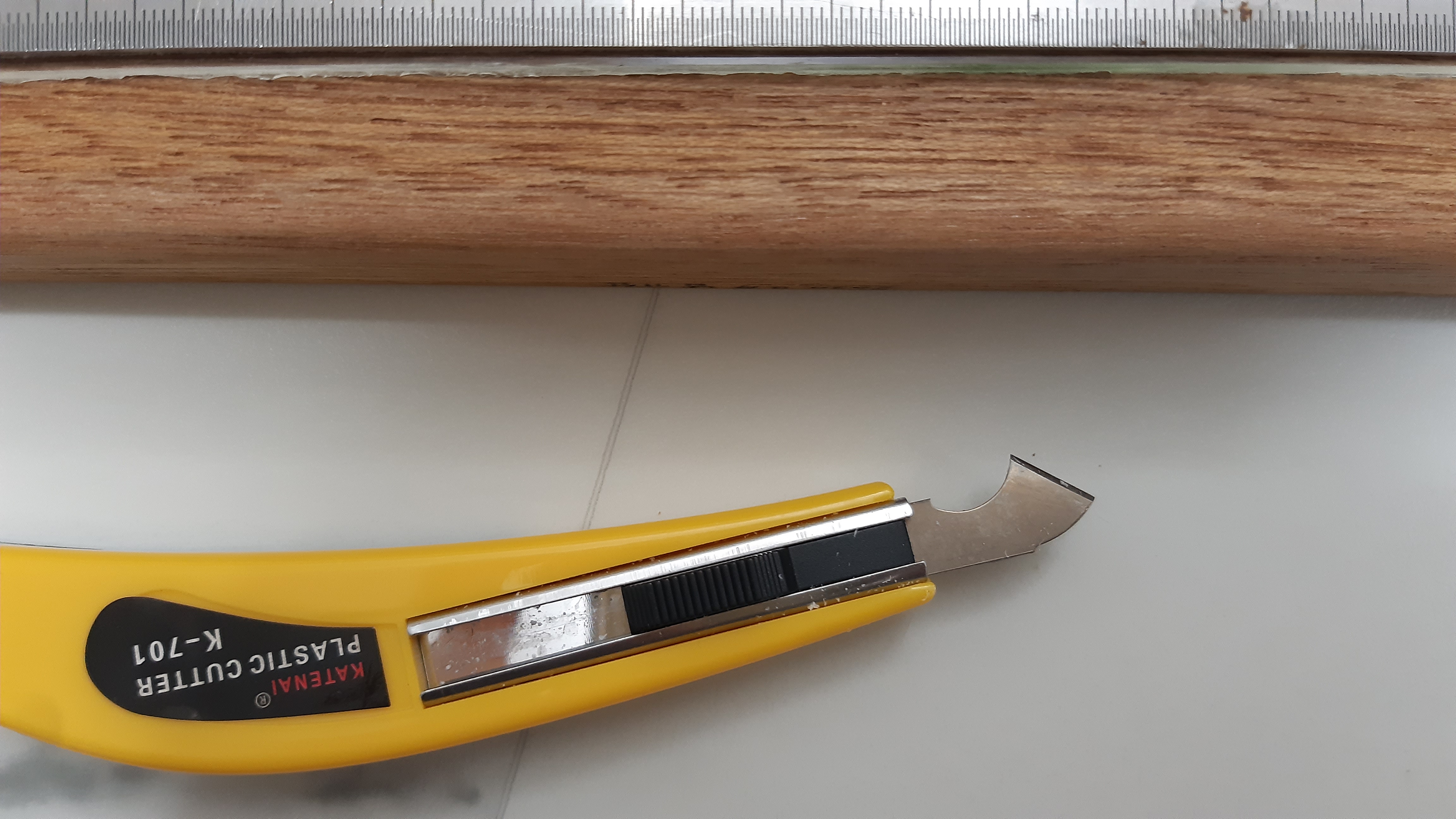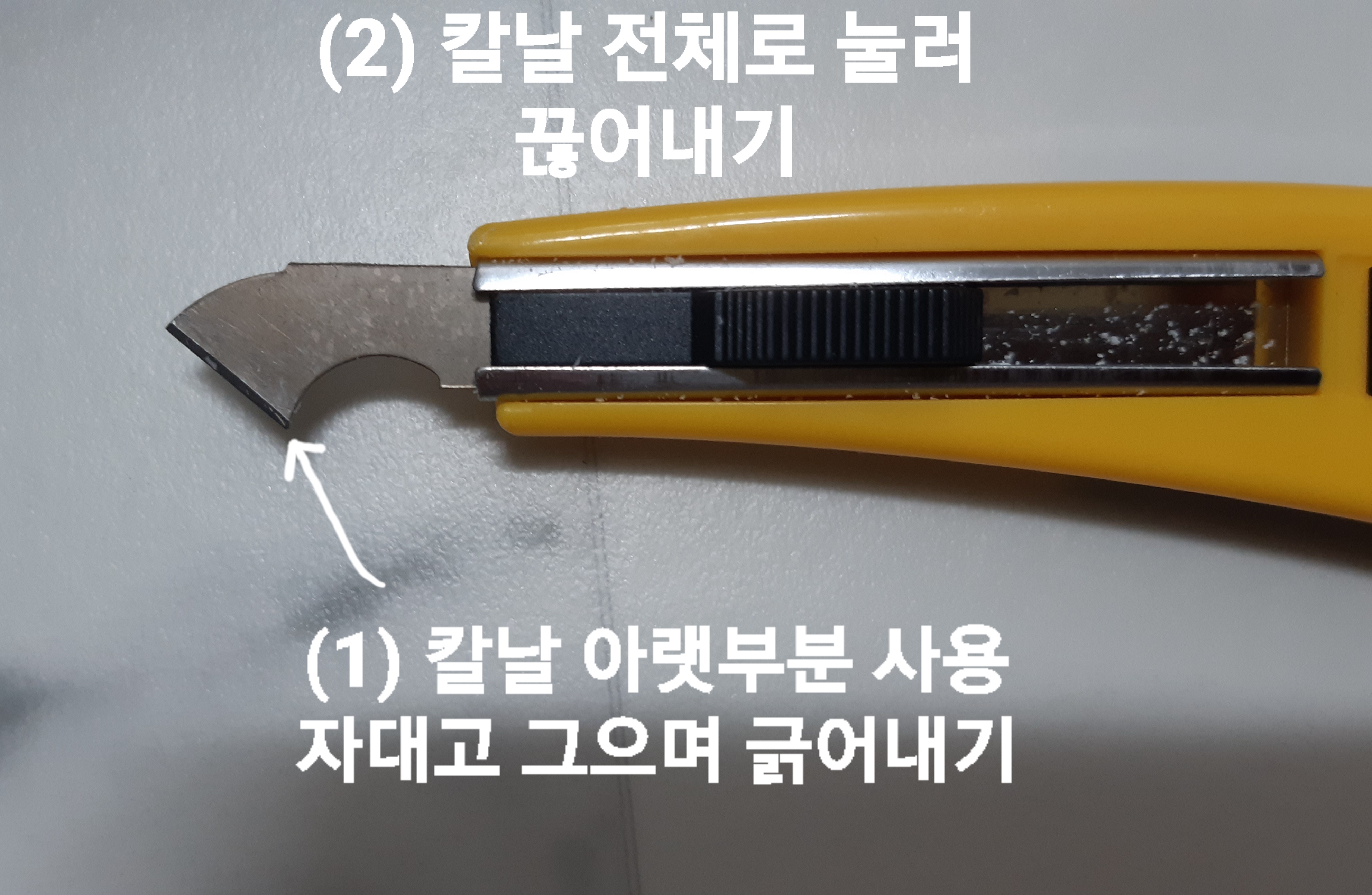 자를 대고 아크릴의 1mm 부분을 보이도록 한 뒤, 칼을 뉘어 칼날의 아랫쪽을 이용해 손잡이 쪽으로 당겨서 여러번 그으면 아크릴이 실처럼 나오면서 홈이 파집니다. 홈이 깊게 파져서 끊어지게 되면 칼날 전체로 눌러서 끊어냅니다.