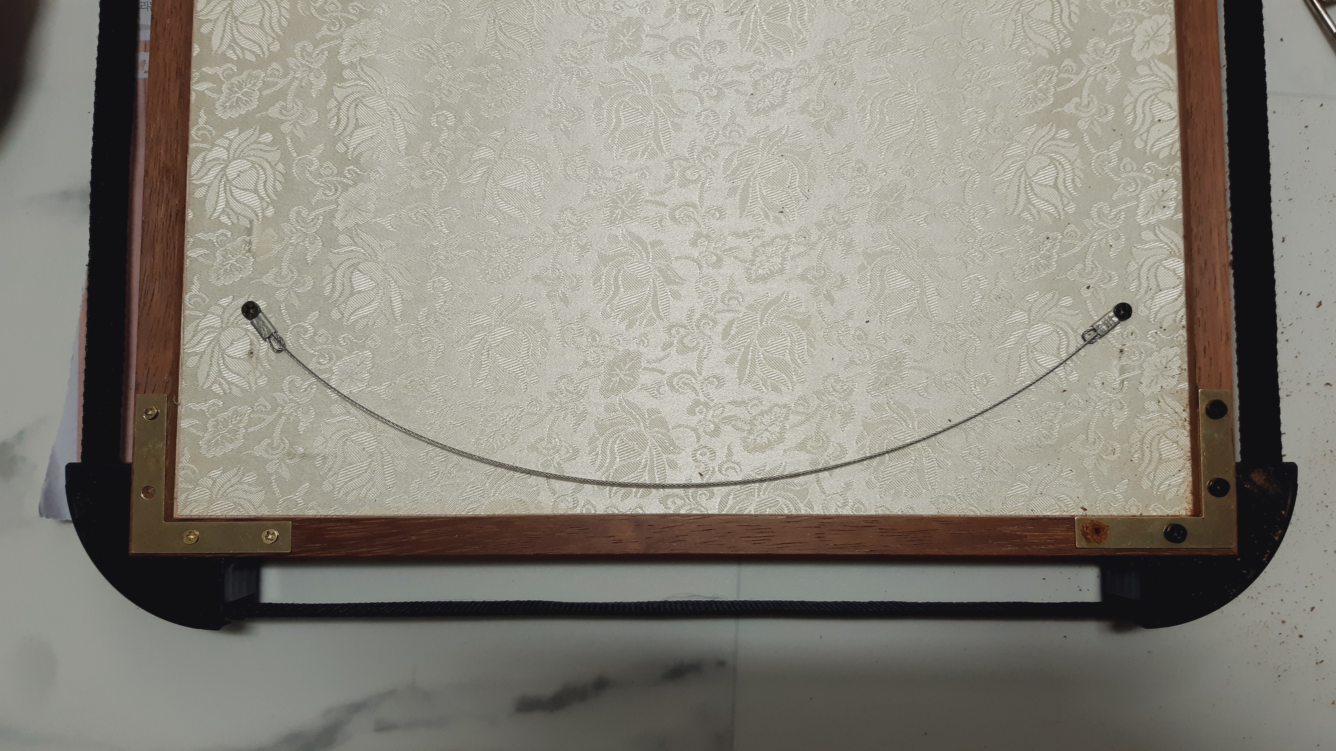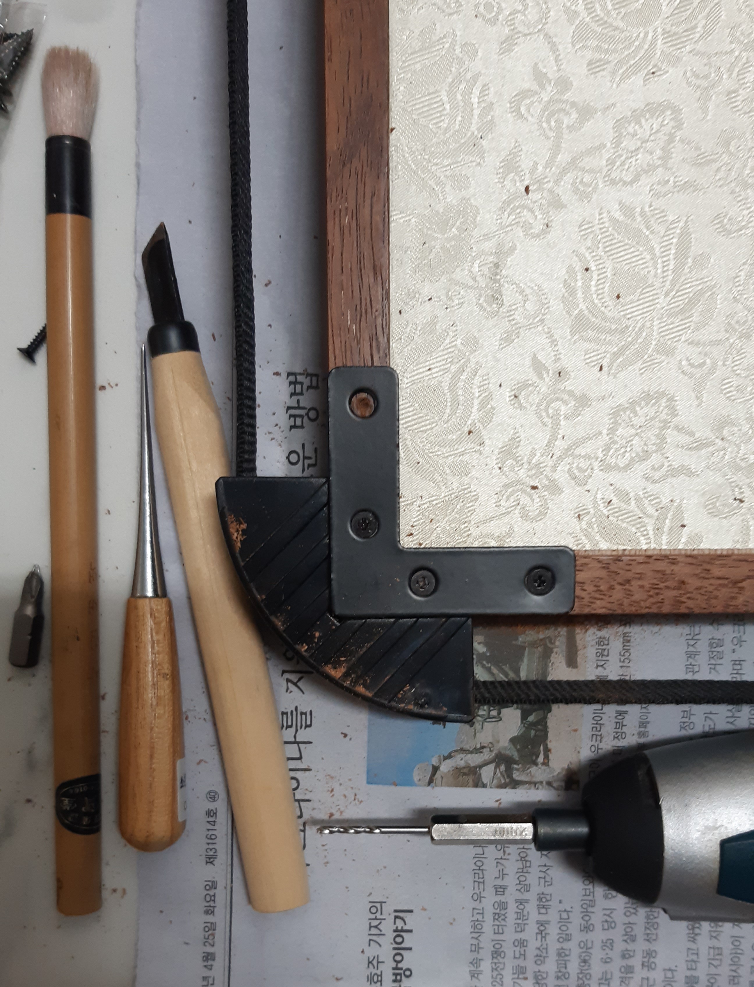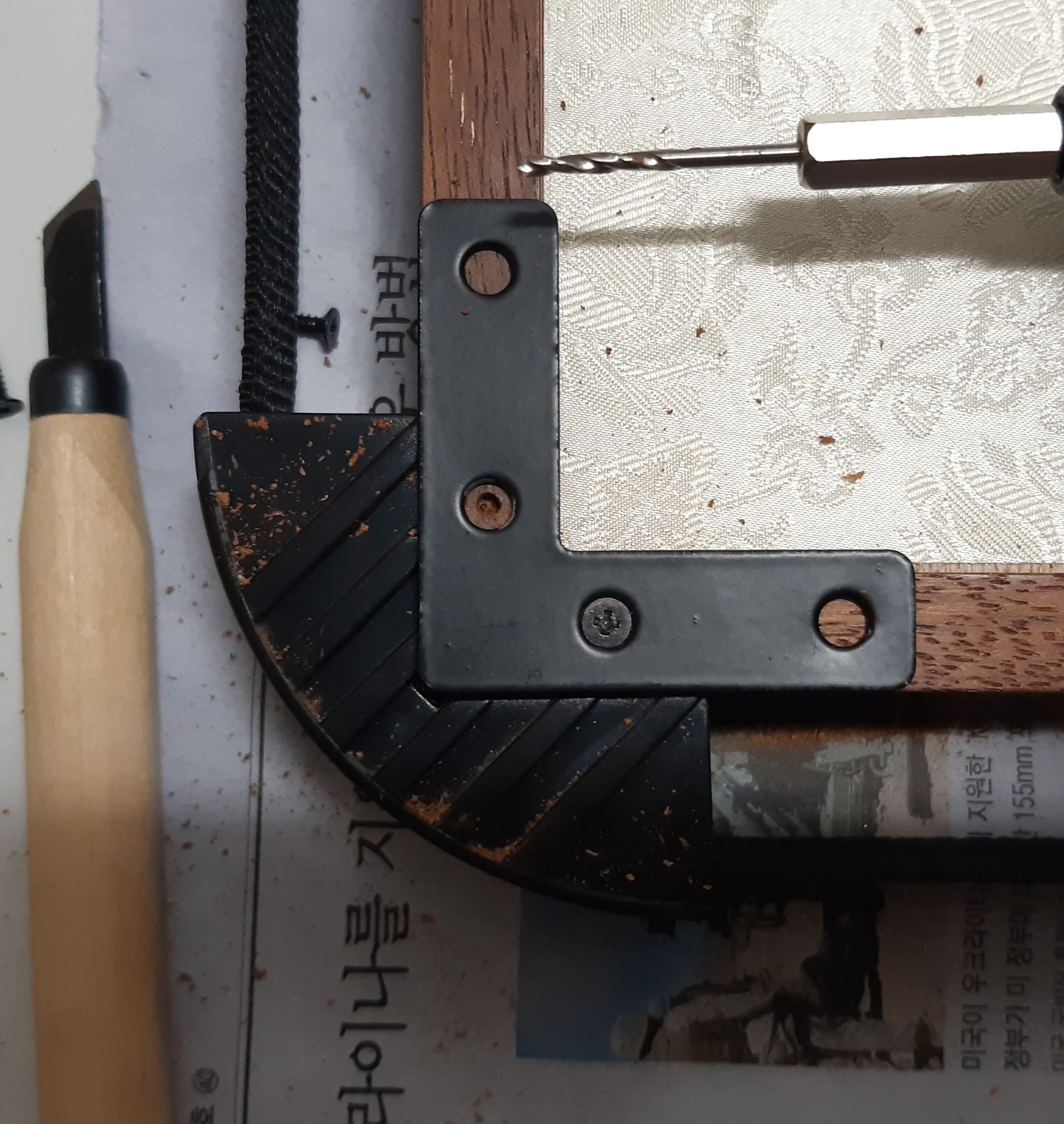 옆면에 비단 붙임, 뒷면에 타카 다시 박고 비단 다시 붙임, 아래쪽도 본드로 고정 ㄱ자 평철 박음, 투명아크릴 닦아서 끼움. 노란평철 제거하고 딴혀쪽매 넣음