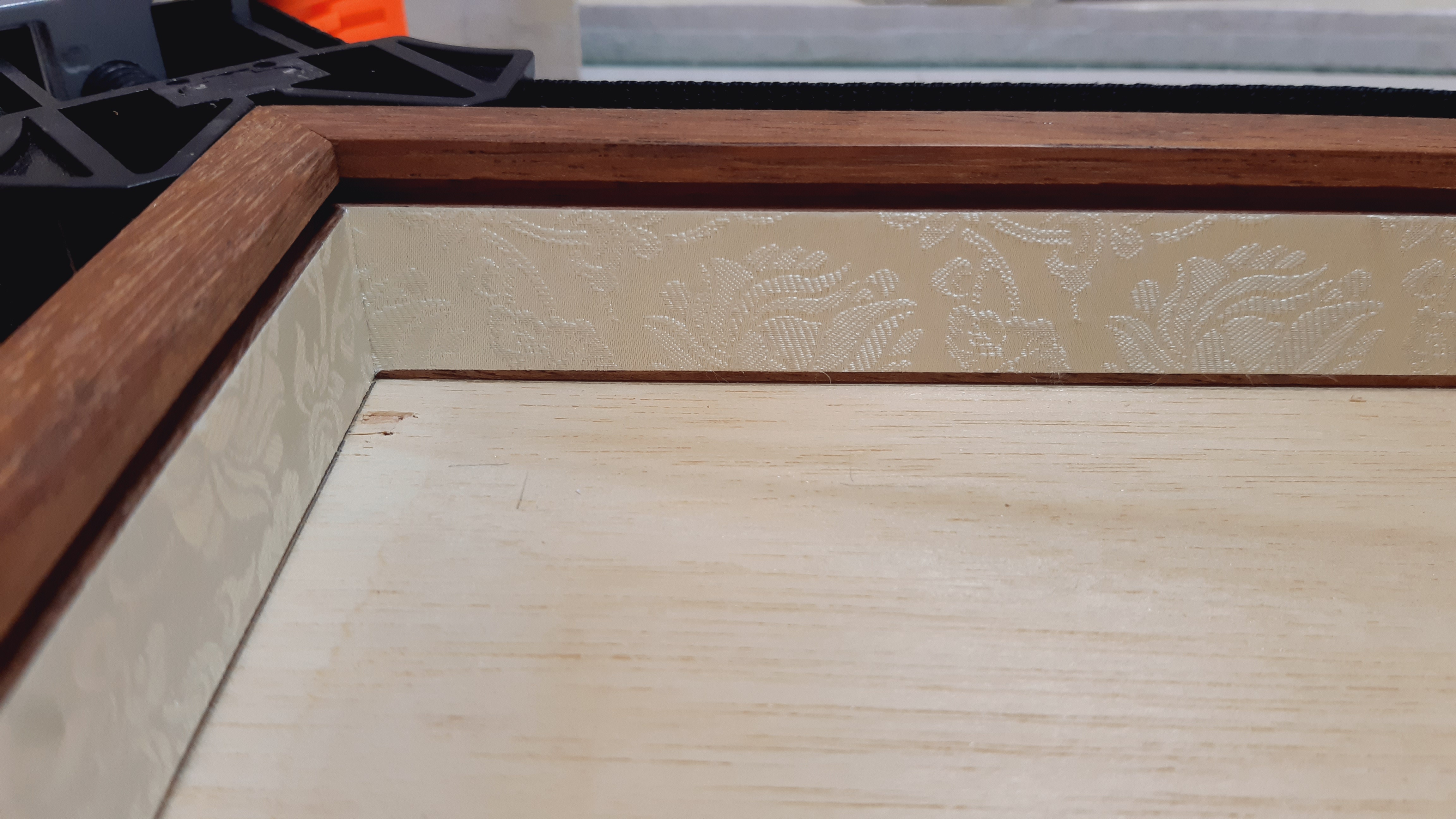 (후레임 두께 45도 재단 부분에 덮이게 붙이면 안됩니다. 나무 끼리의 접착면은 울퉁불퉁하면 안 붙습니다. 1~2mm 넘어가게 붙인것은 건조 후 면도칼로 다 깎아 냈습니다.)