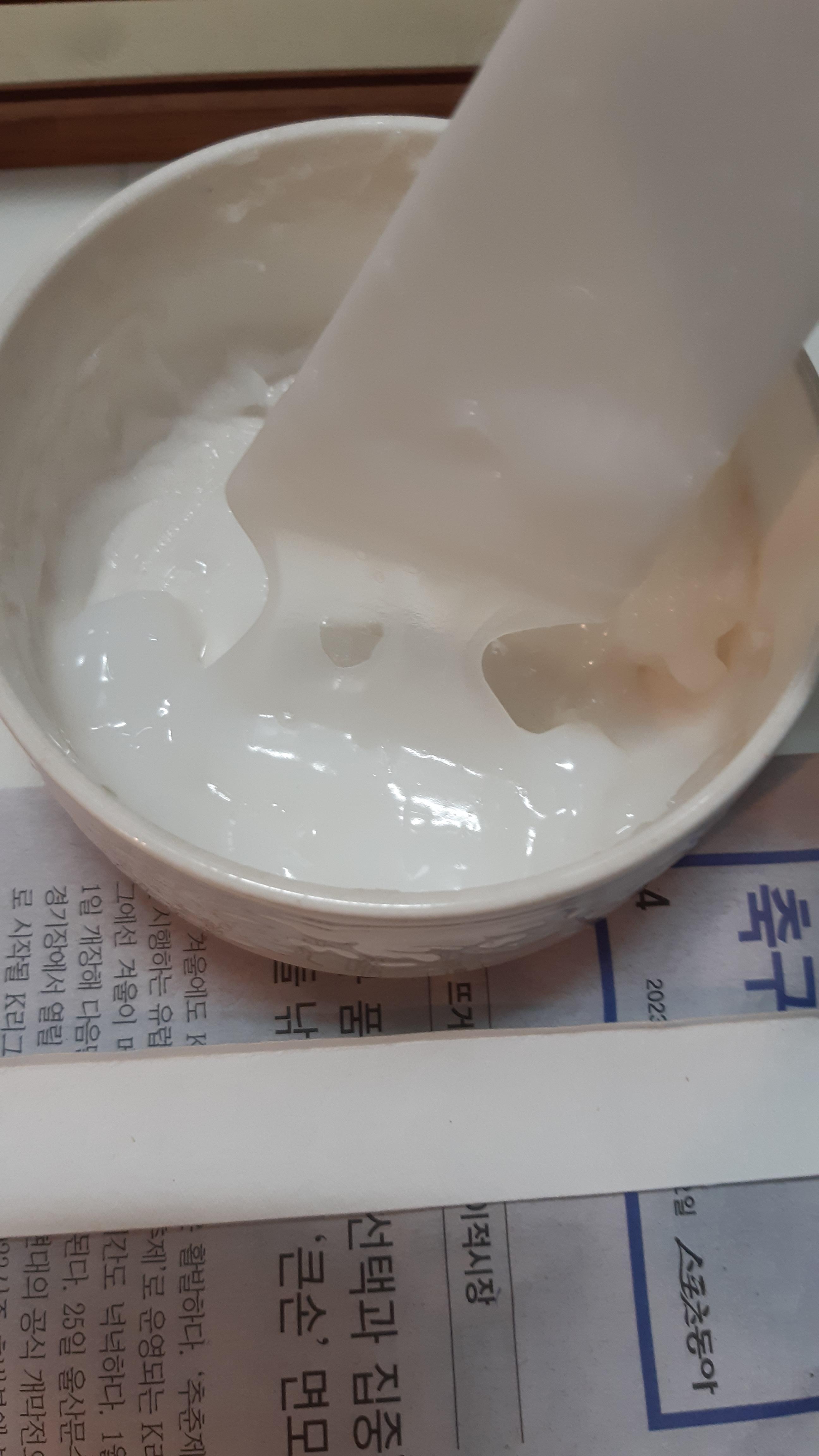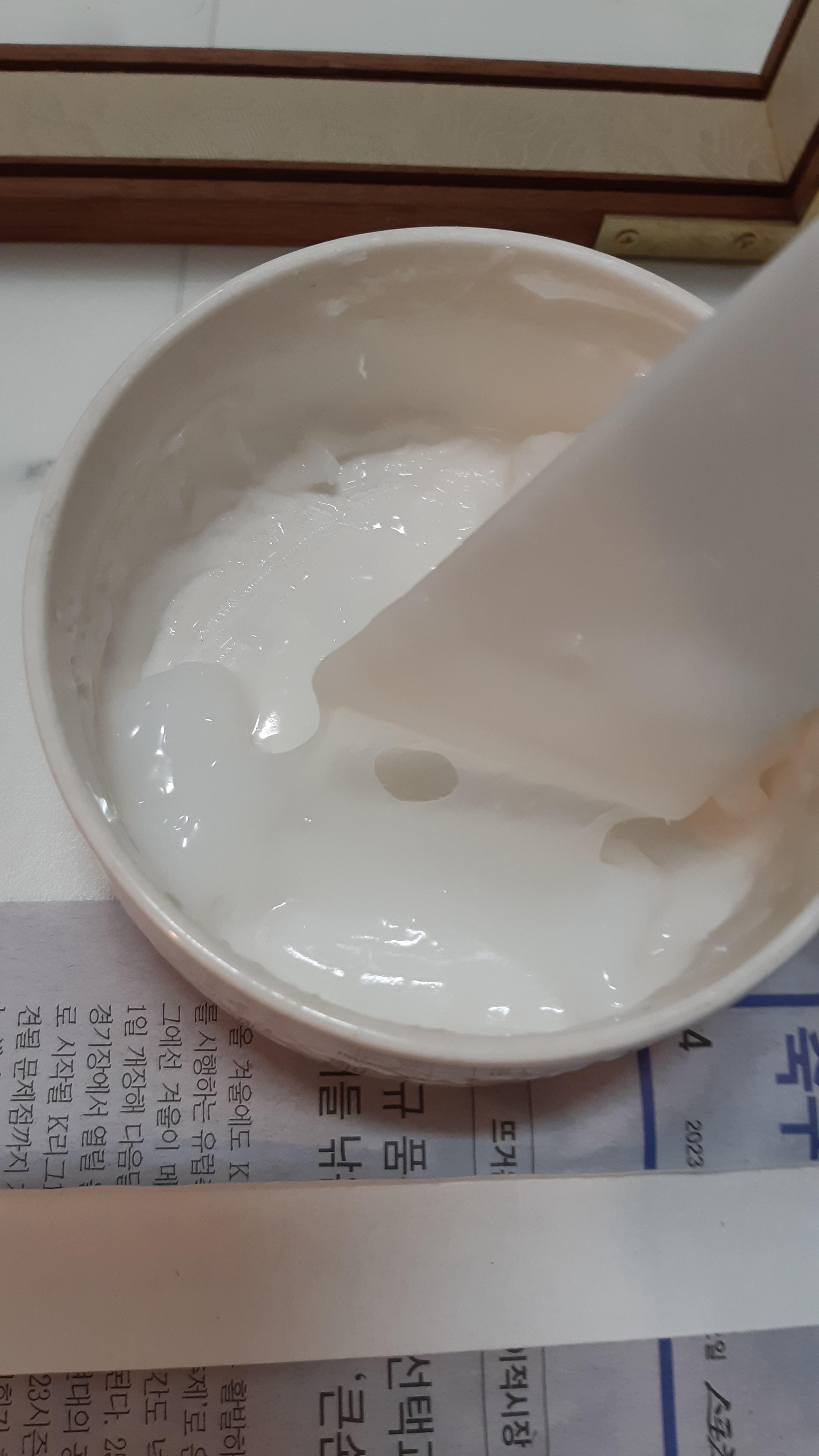 • 풀은 소맥전분으로 쑤었습니다. 소맥전분과 물을 1:3 으로 섞어서 나무 공이로 20분동안 저으면서 끓여야 합니다. 흐르는 찬물에 식힌 후 체에 통과하여 사용합니다. 된풀로 씁니다.