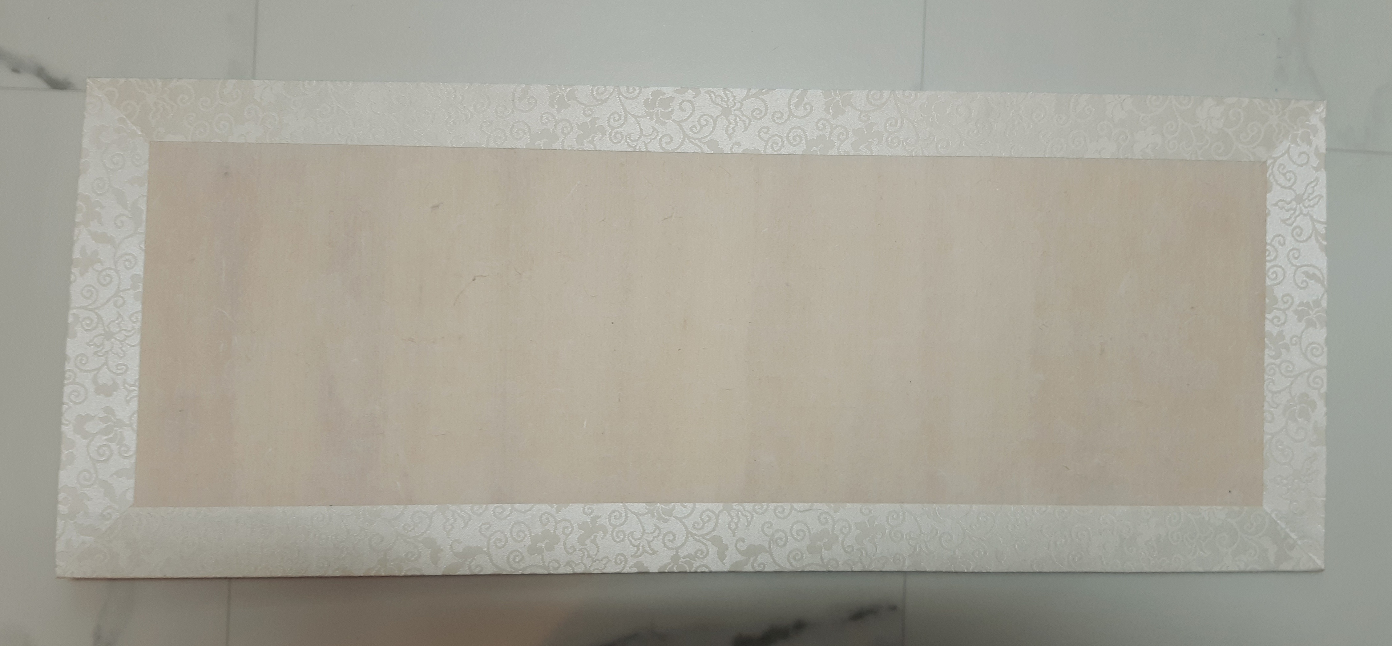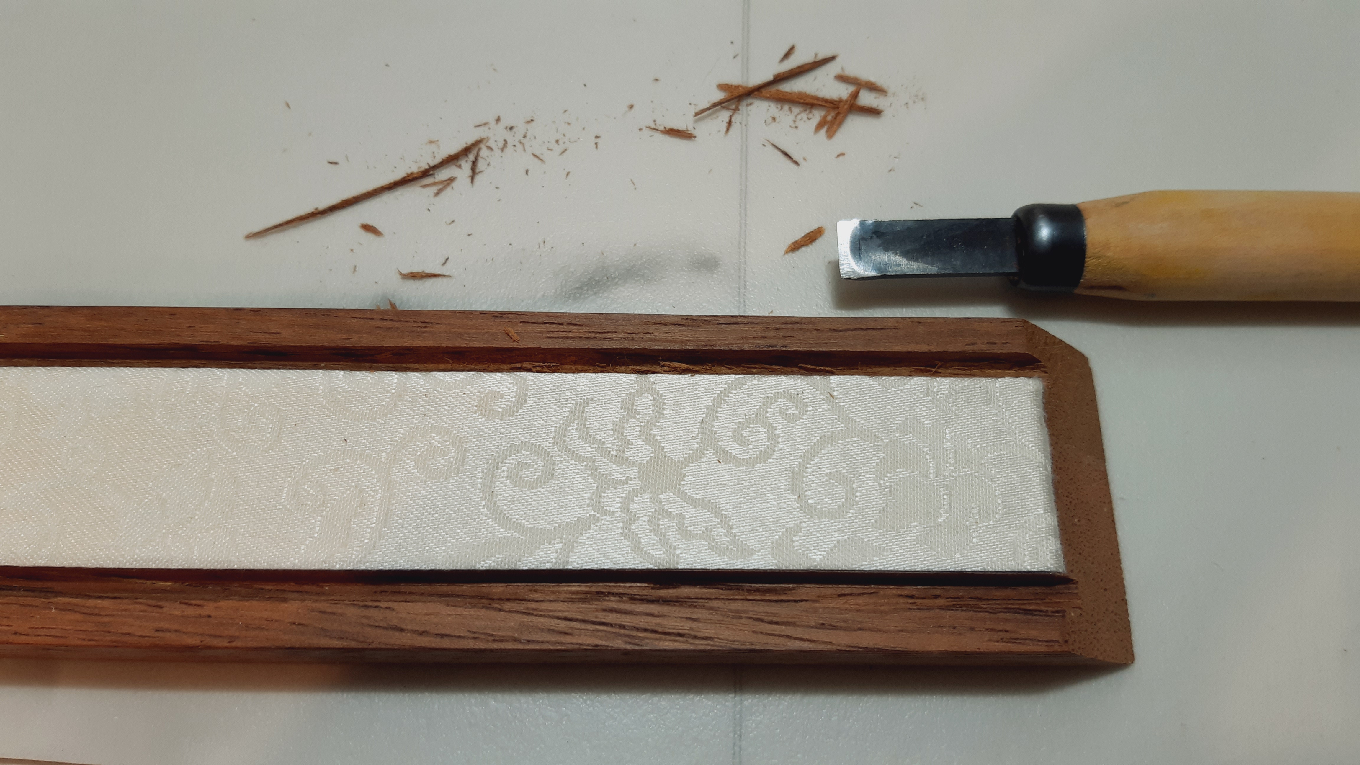 후레임 옆면 너비인 23mm 이므로 26.5mm 폭으로 자르고, 3.5mm 부분을 송곳으로 그어 접은 후에 펼쳐서 풀칠하였습니다. (홈 한쪽으로만 비단이 들어가 붙음, 양쪽으로 들어가야 하는데 그러면 비단붙은 뒷판이 안들어감)