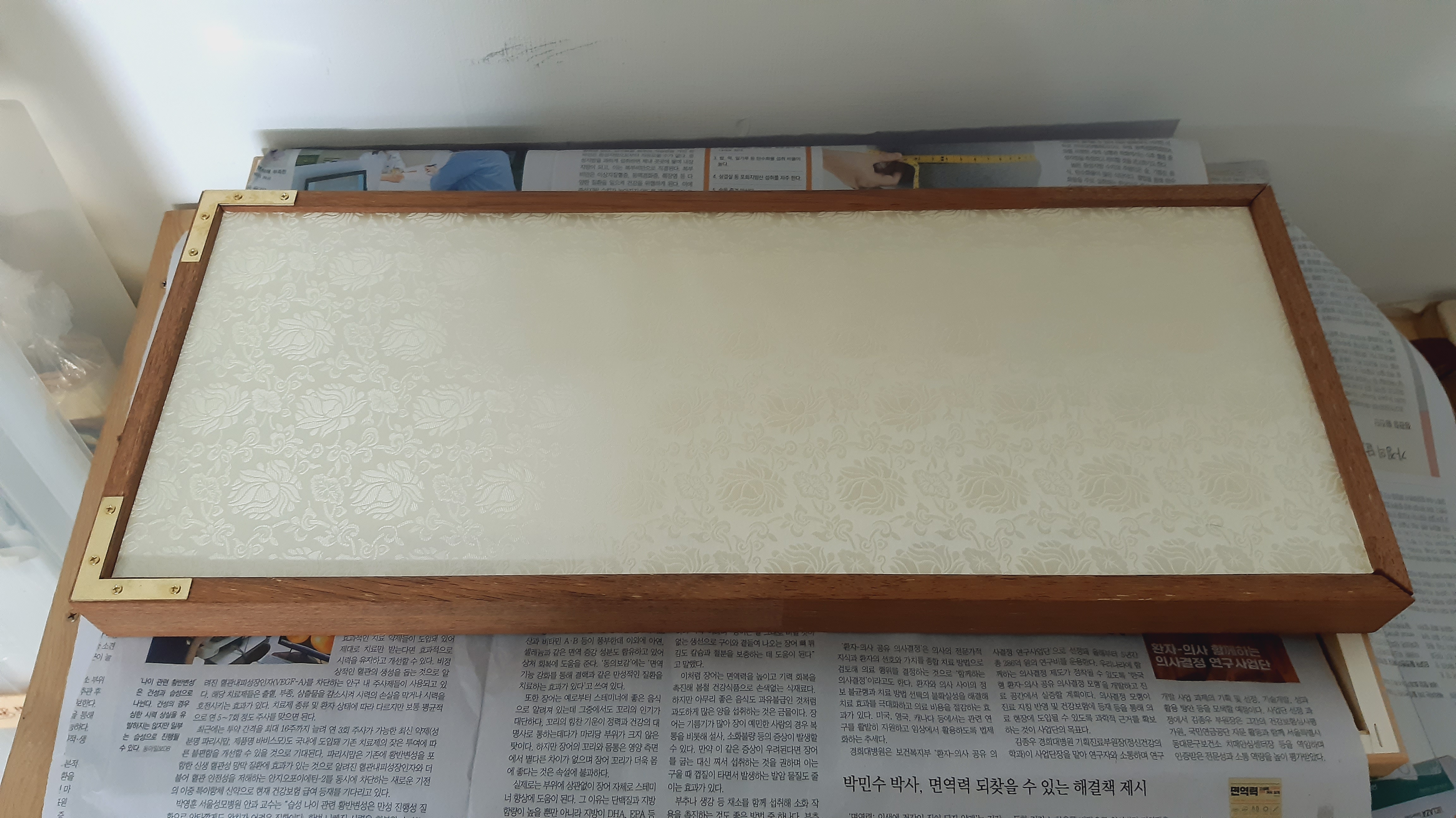 붙여놓고 보니 홈 안에도 비단이 들어가야 함을 알게 되었습니다. 떼어낼 수는 없고 위에 다시 붙였습니다.