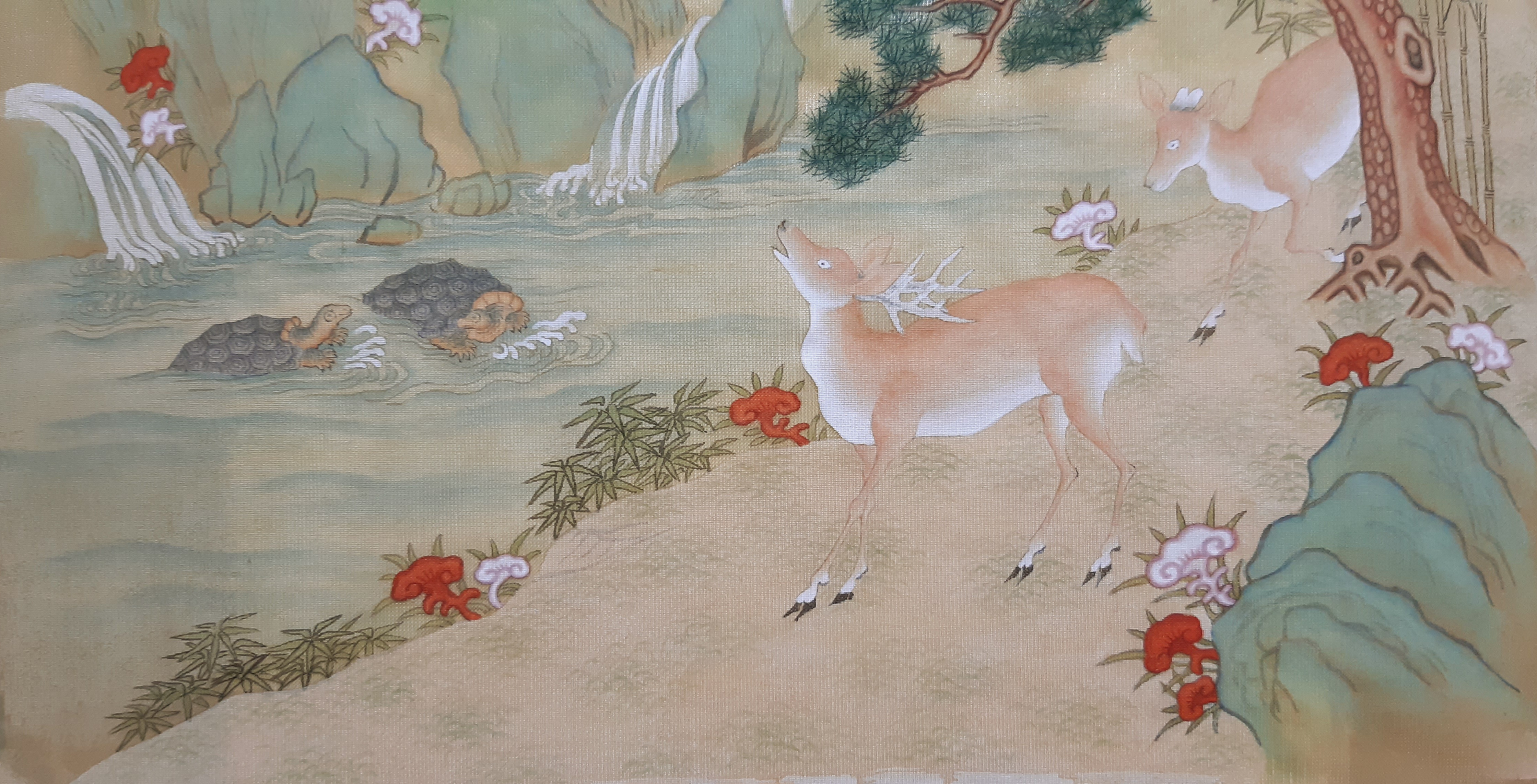 바위에 연두색 석채를 칠했다가 지우고, 석채 백록을 칠했다가 지우고 있습니다.