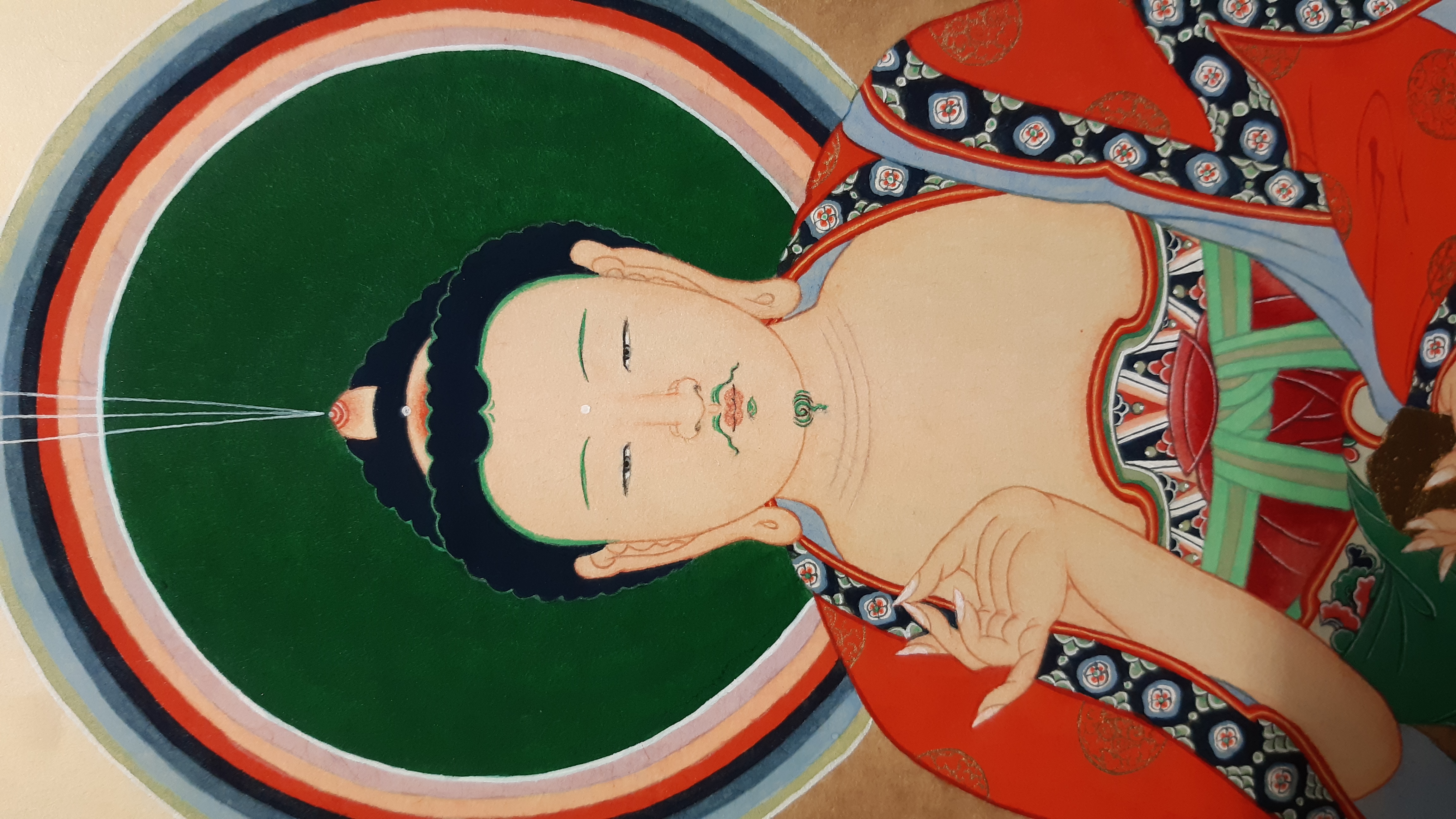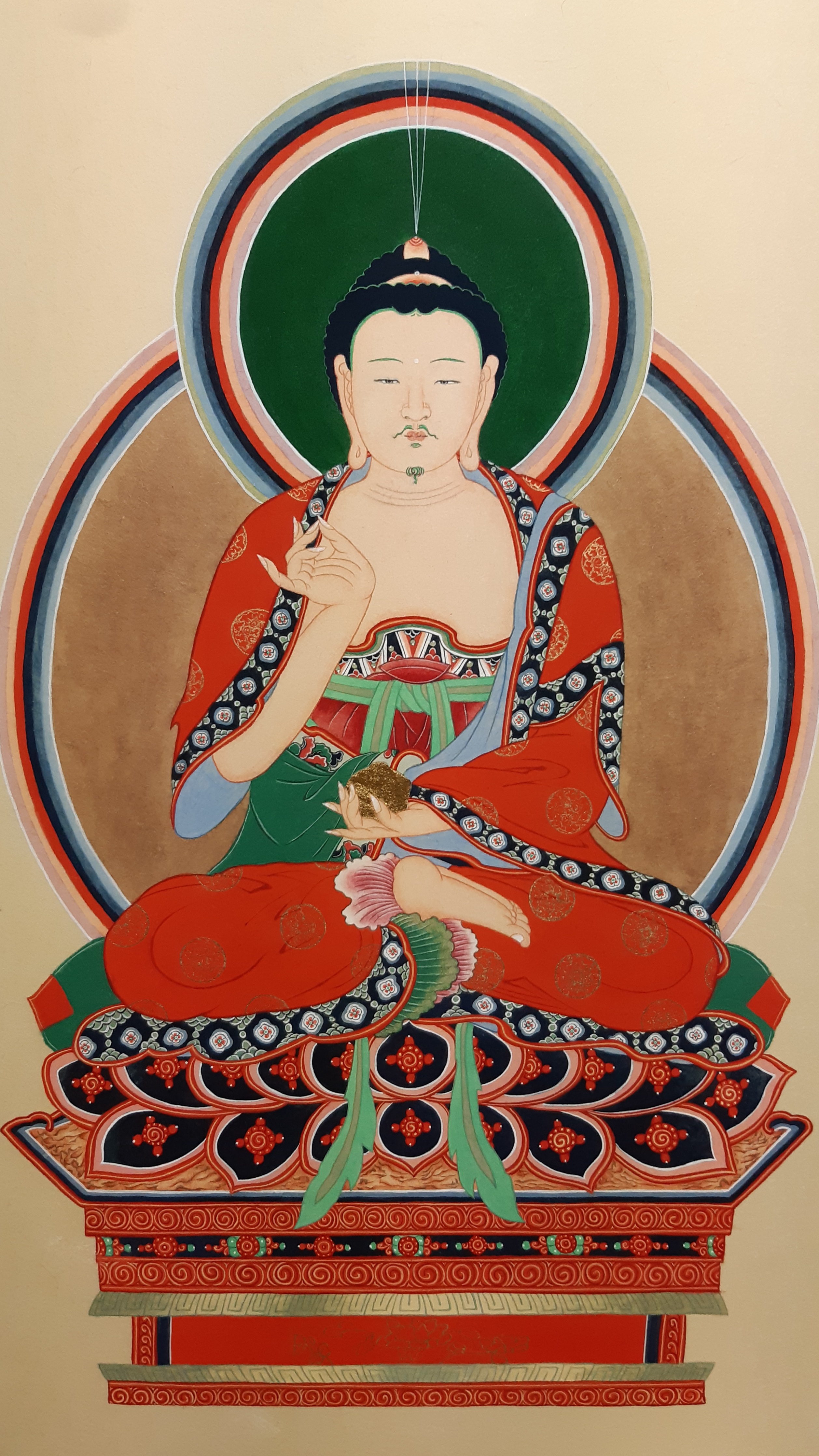 부처님이 정면을 보고 앉아 계신 그림인 경우, 얼굴의 이목구비가 대칭인지, 흰털점, 수염, 육계, 가슴 만자 글씨가 정가운데 위치하는지 반드시 확인하여야 합니다.