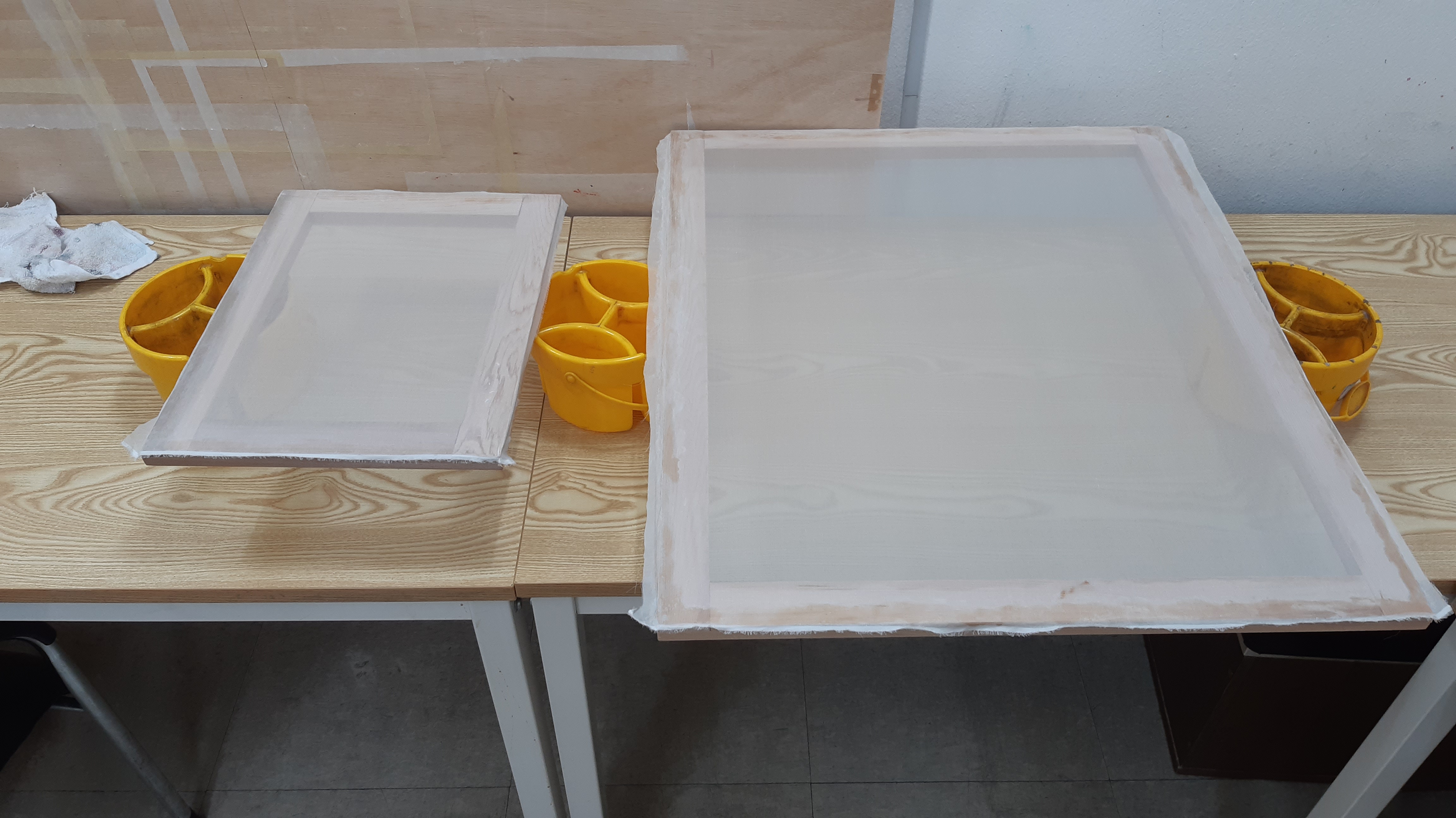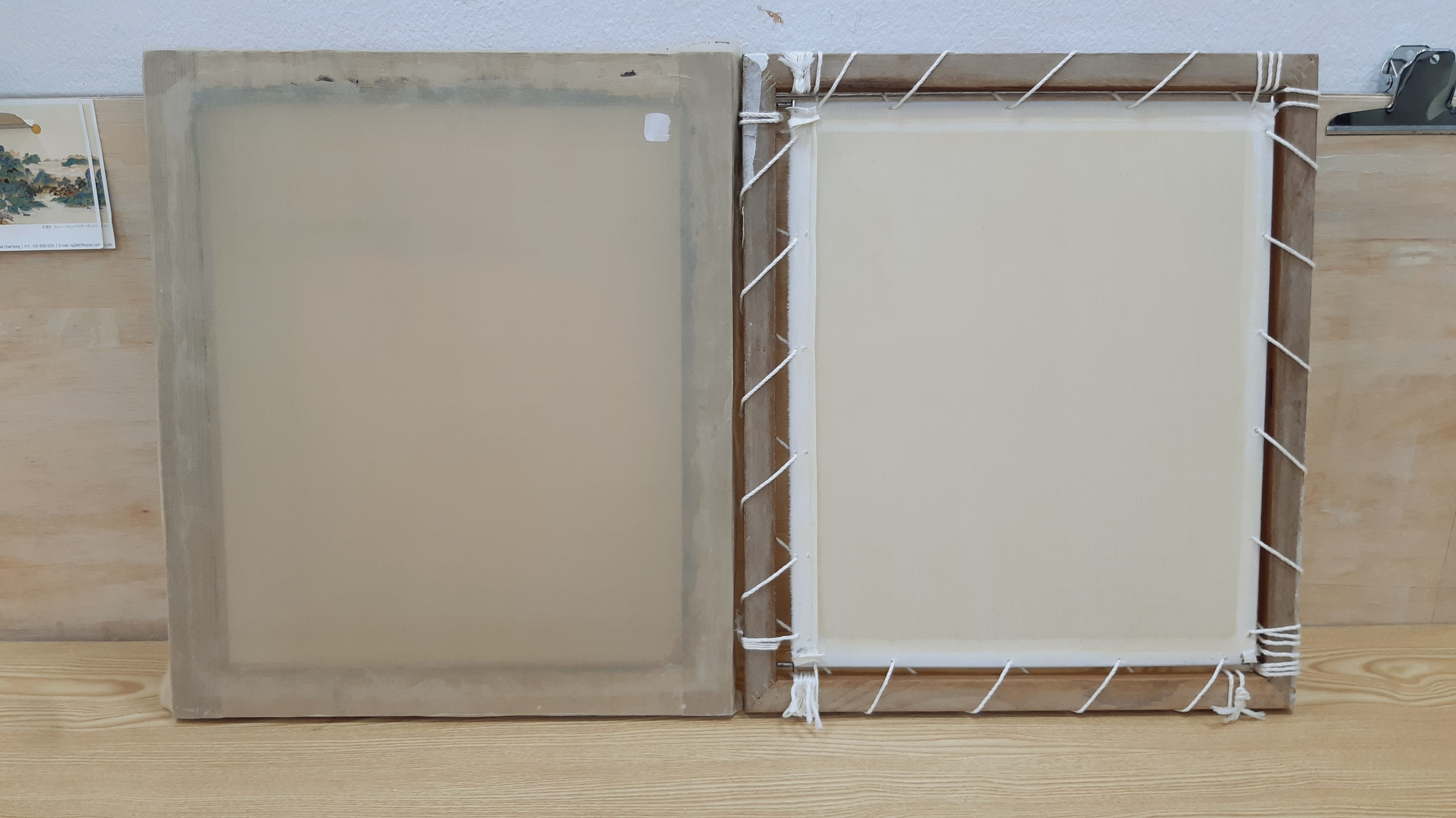 작품용 20호와 연습장 6호 견틀에 비단을 붙이고 칠하는 염색 후 교반수 칠 1회 하였습니다.