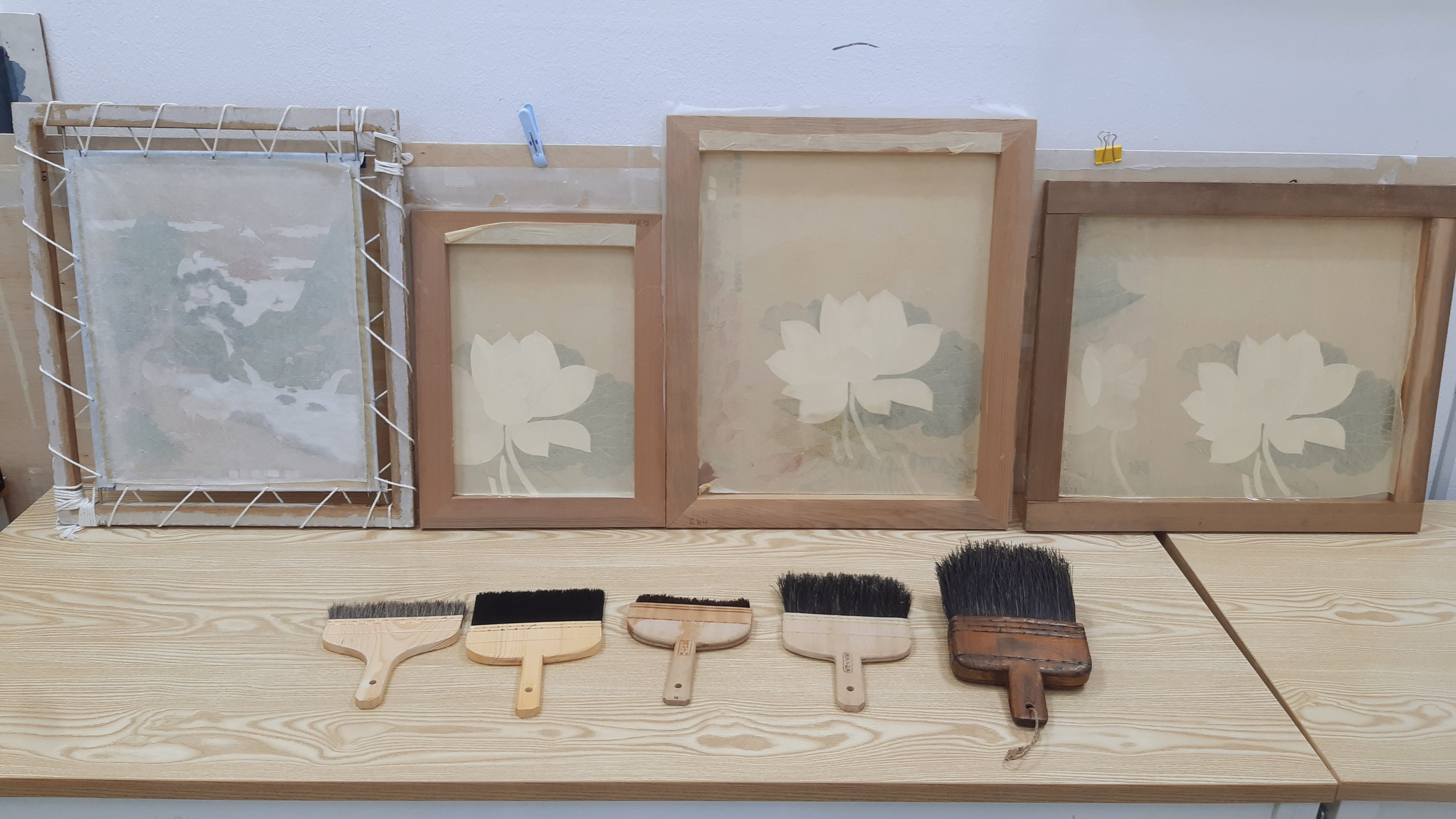 풀을 진하게 쑤어 배접지에 발라 붙인 후, 오간자3합은 다짐솔(타솔, 타격솔) 로 내리쳐 배접순지를 비단 올 사이사이에 붙여 넣고, 얇은 중국화견은 종려나무 마무리솔로 힘주어 여러번 쓸어 붙입니다.