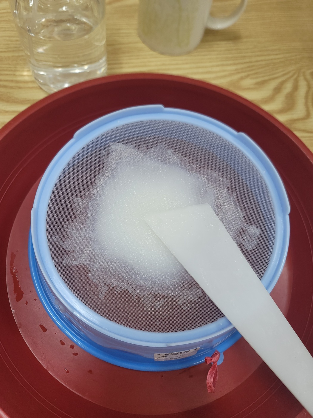 소맥전분으로 쑨 풀을 체에 통과합니다.