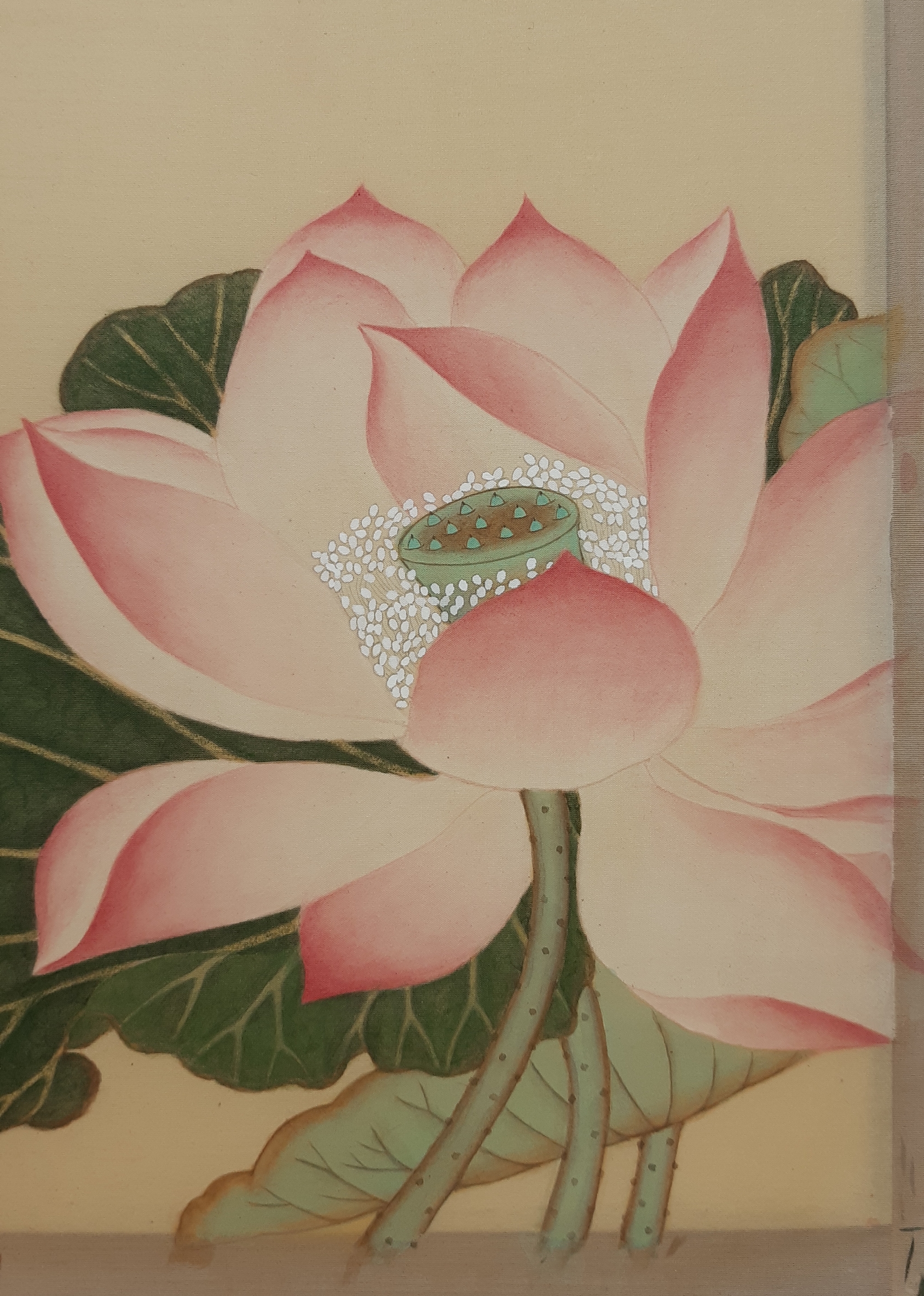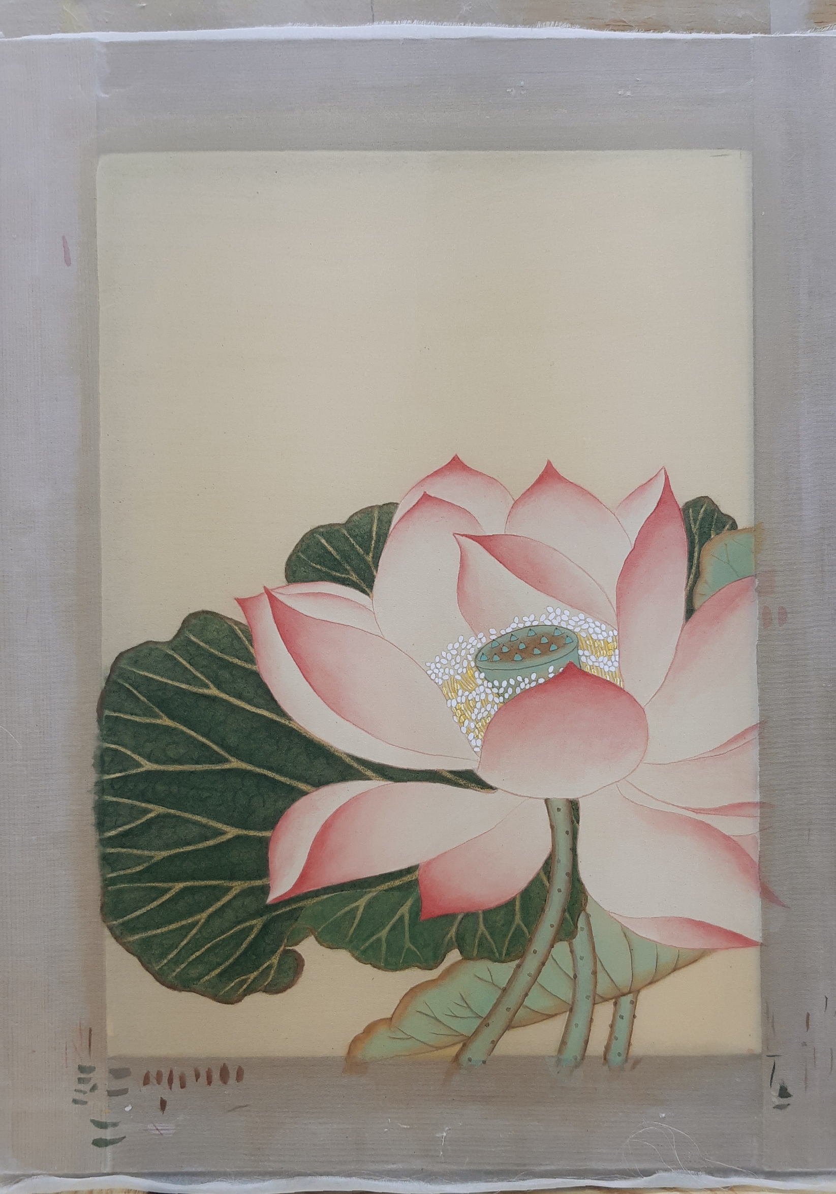 비단 그림을 견틀에서 떼어서 배접하여 건조판(합판이나 판넬) 에 붙여야 합니다. 합판을 또 구입하시라고 하기가 죄송스러워서 견틀에 붙은 채로 배접 하였습니다.