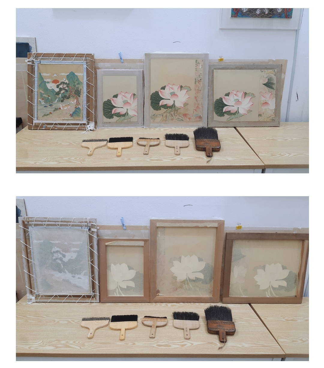 배접지에 풀을 칠하고나서 ㅡ> 촘촘한 말털솔로 풀을 밀어내 버리고 (세로로) ㅡ> 촘촘한 말털솔로 풀솔 자욱을 없애고 (가로 솔질) ㅡ> 비단에 붙이고 ㅡ> 마무리솔 솔질하여 붙이고 ㅡ> 신문지 사용하여 솔질하여 물기를 없애고 ㅡ> 다짐솔로 쳐서 배접지를 비단올 사이사이에 심는다.