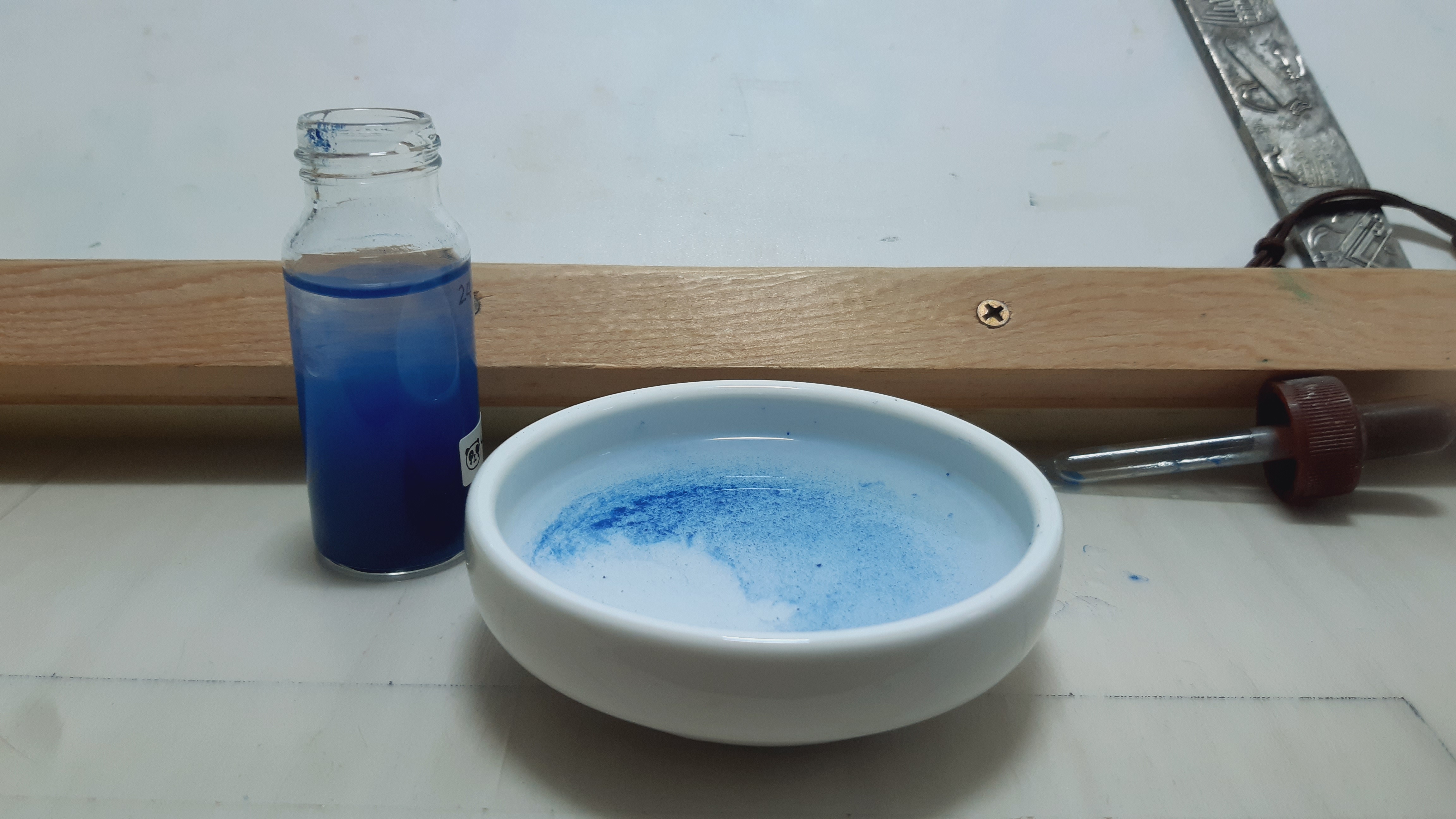 석채를 좁은 병에 담고 뜨거운 물을 넣어 흔들어 물에 부유하는 물감과 찌꺼기들을 제거합니다.