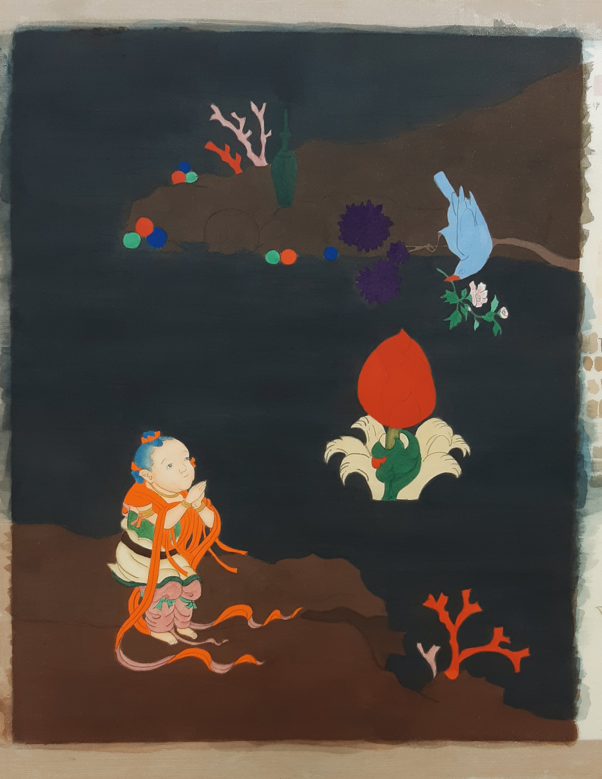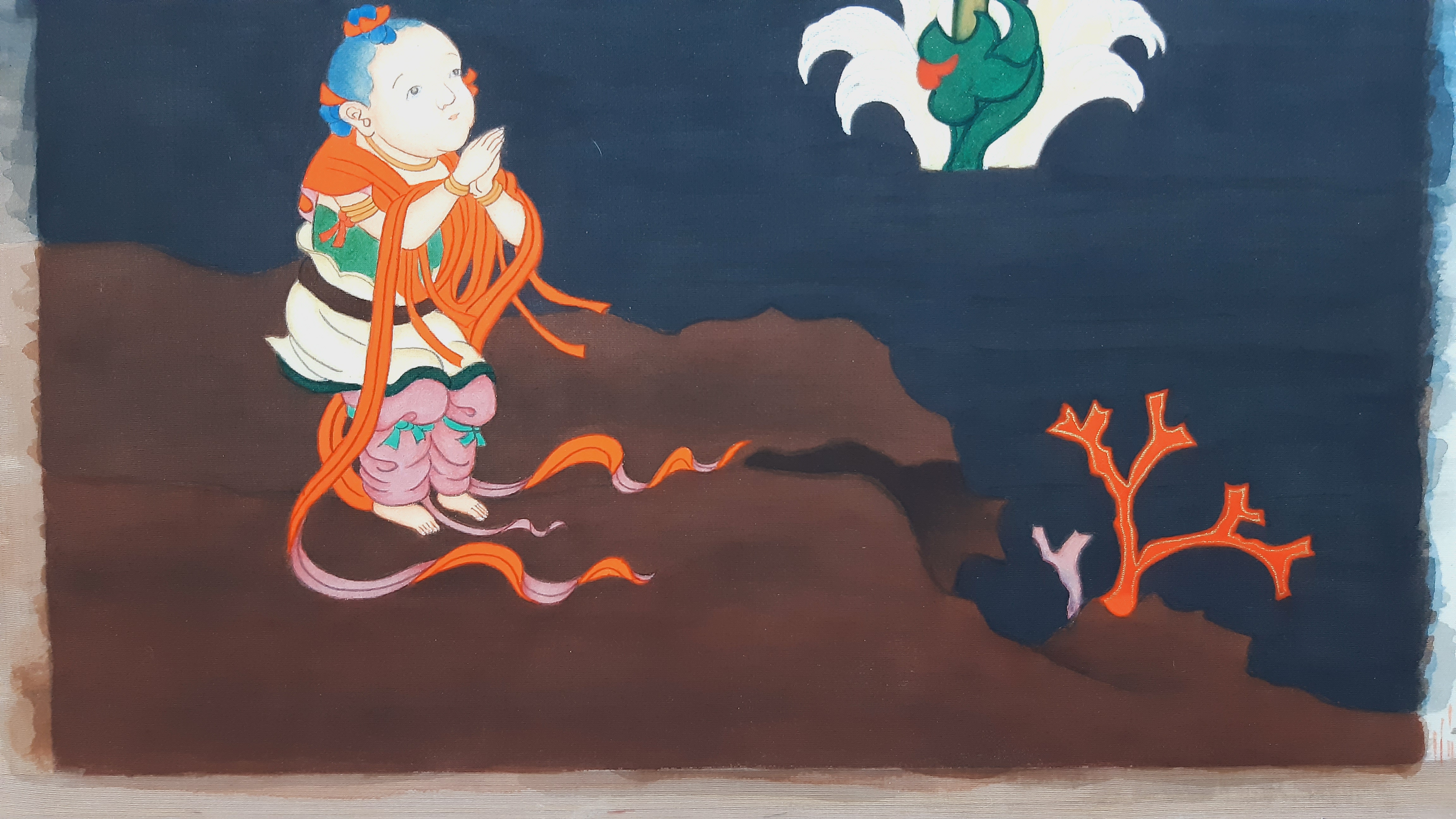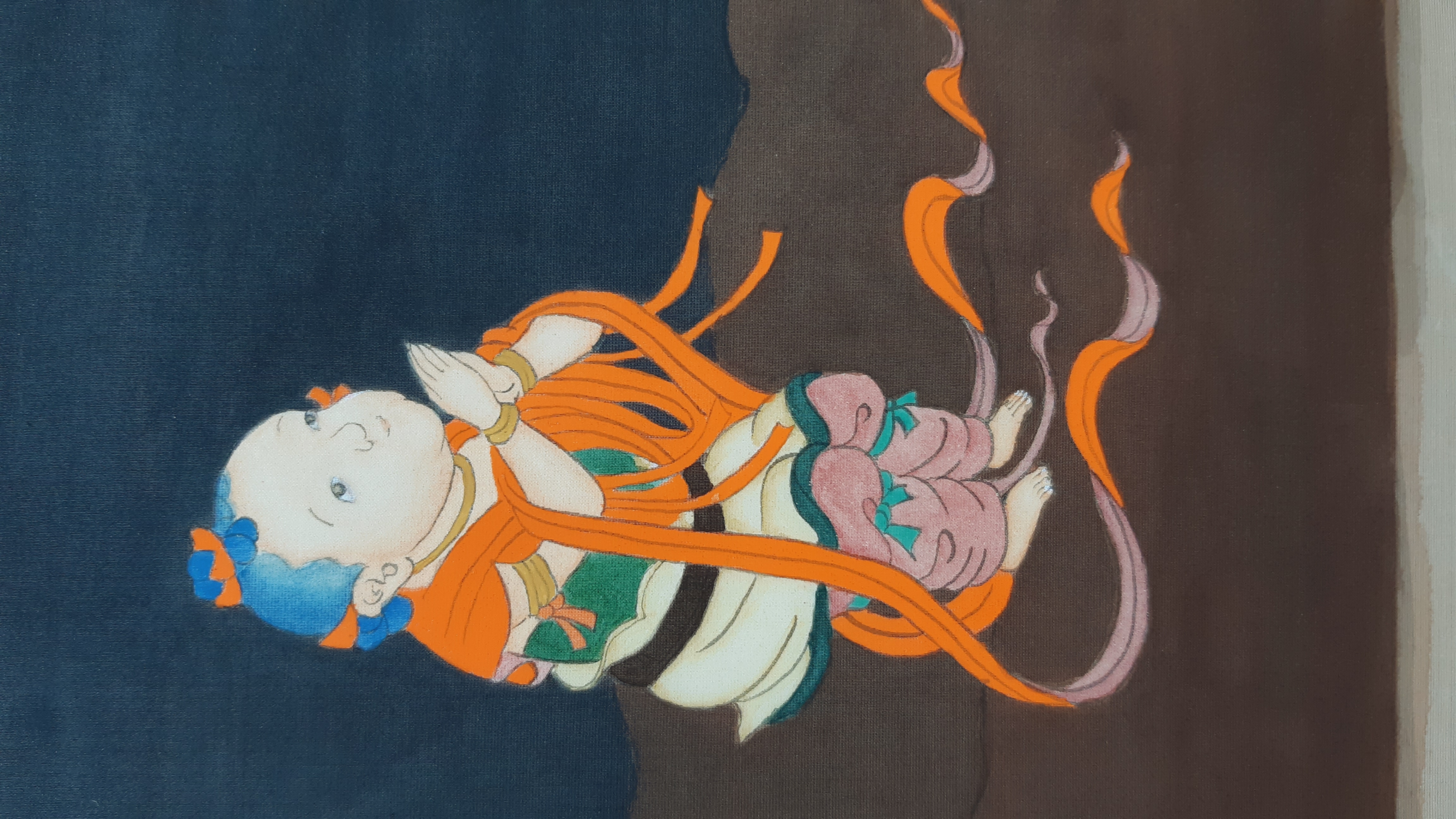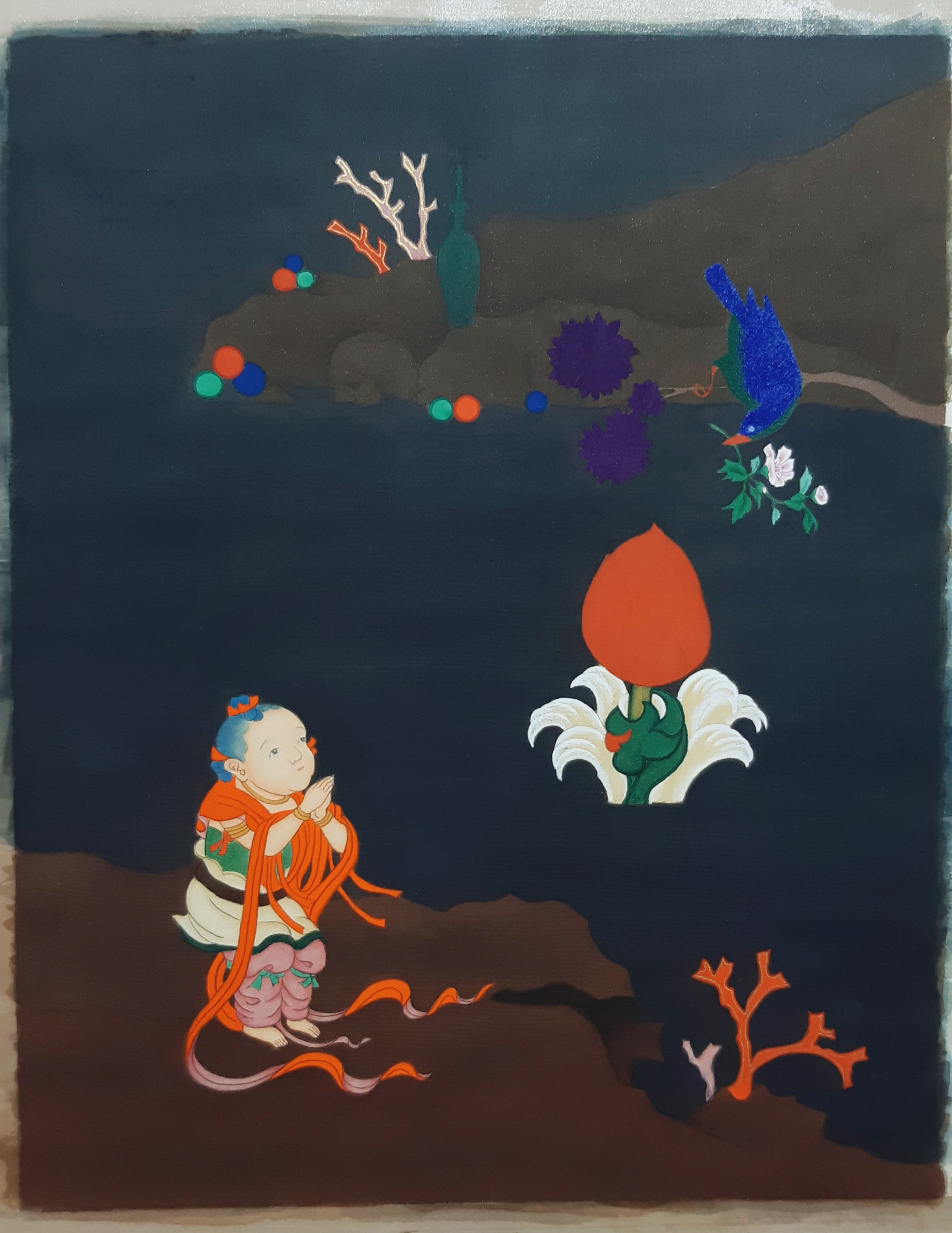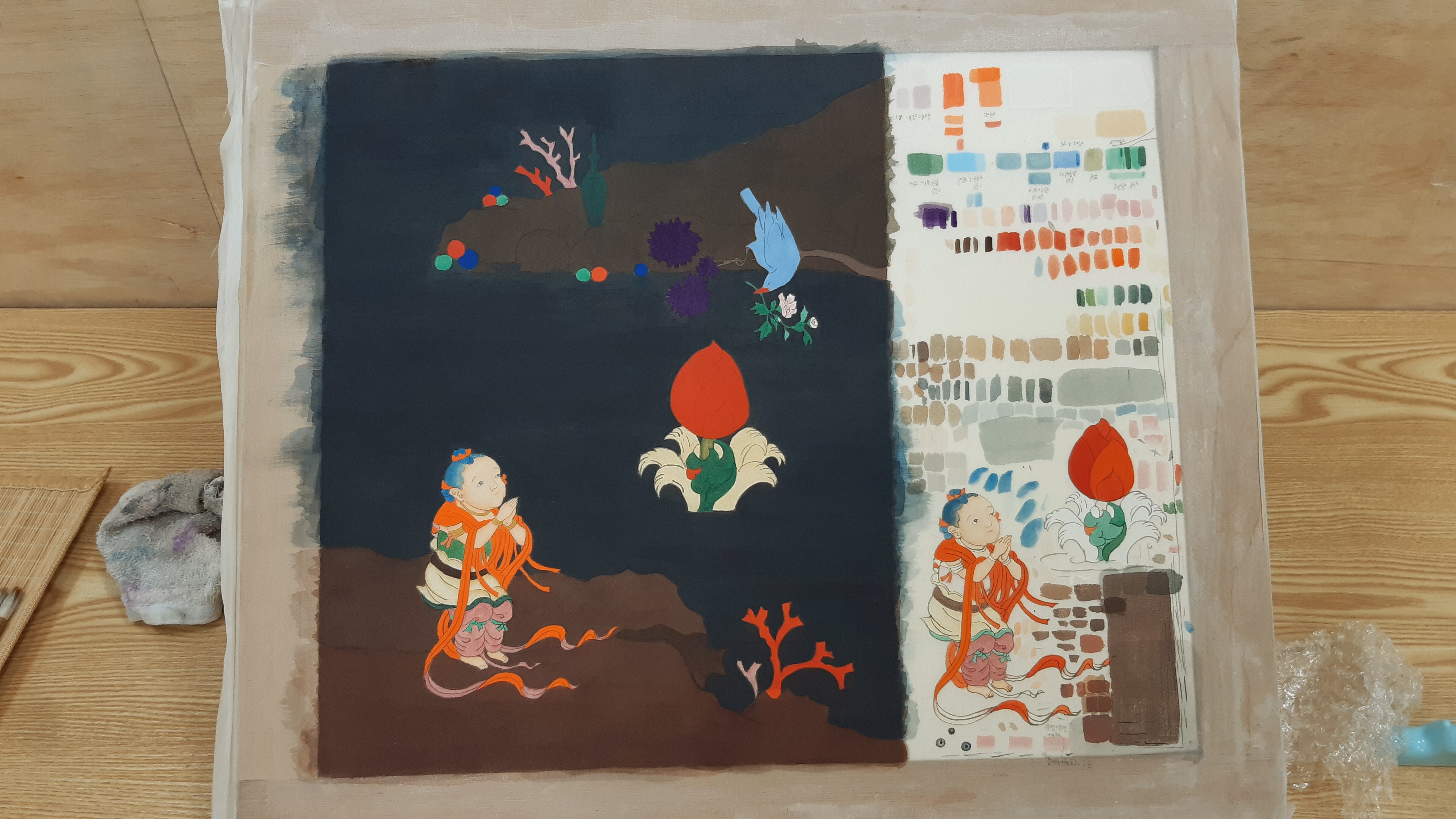 바림과 색톤 조절을 위해 선재동자에 물감을 겹쳐