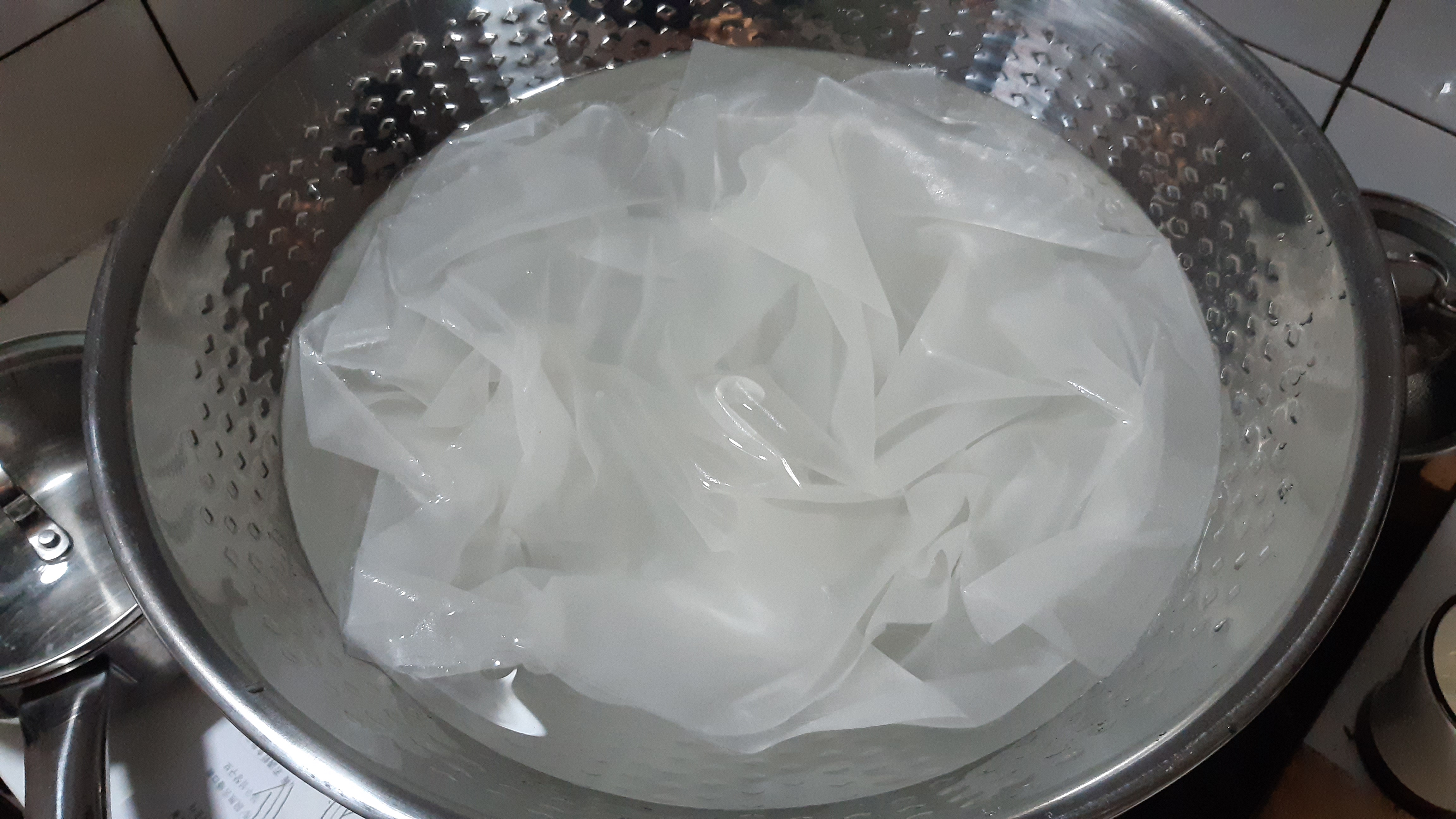 견틀에서 떼어내어 따끈한 물에 아교포수한 것을 씻어냅니다. 충분히 씻어내면 비단이 저절로 수세가 됩니다.