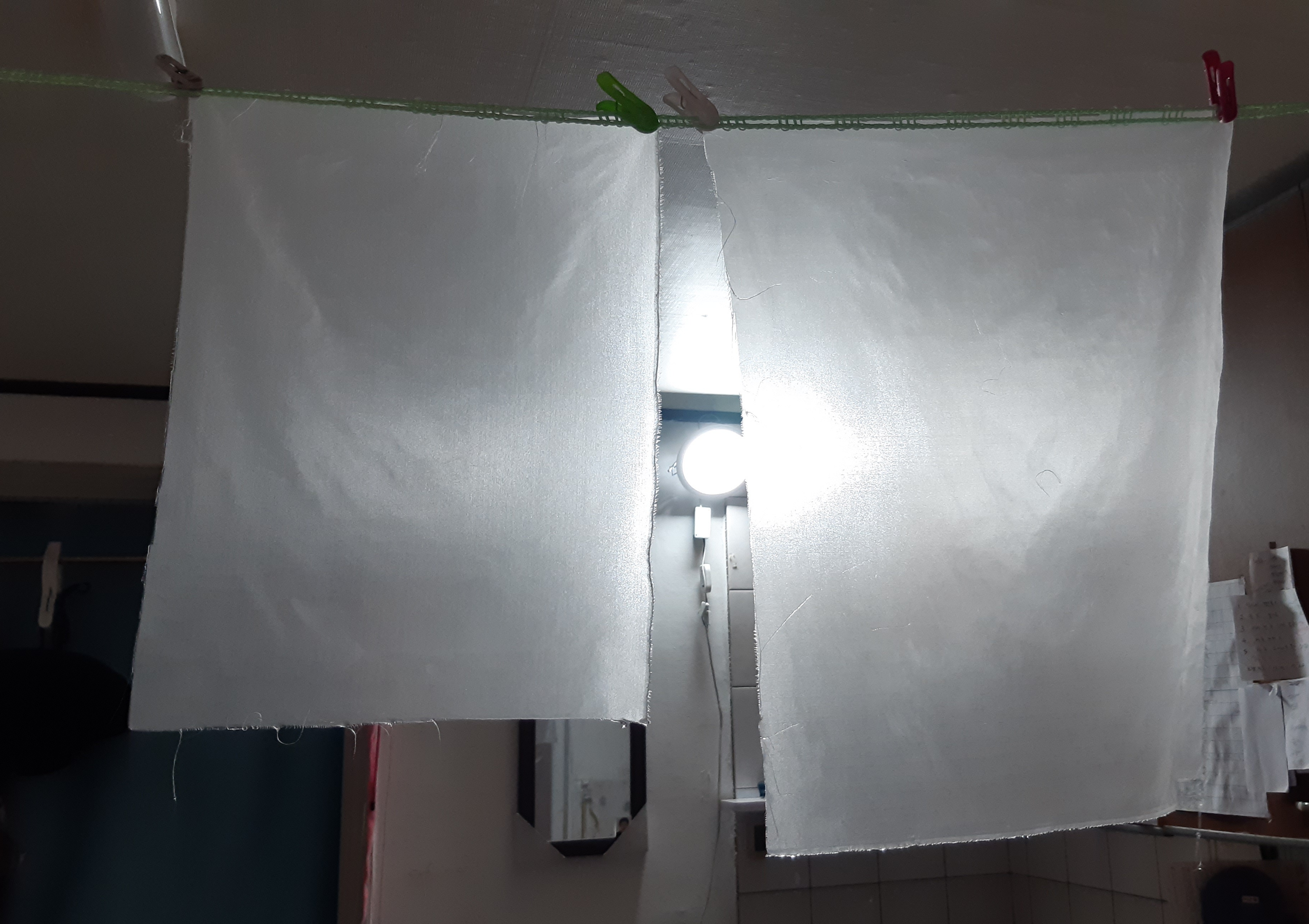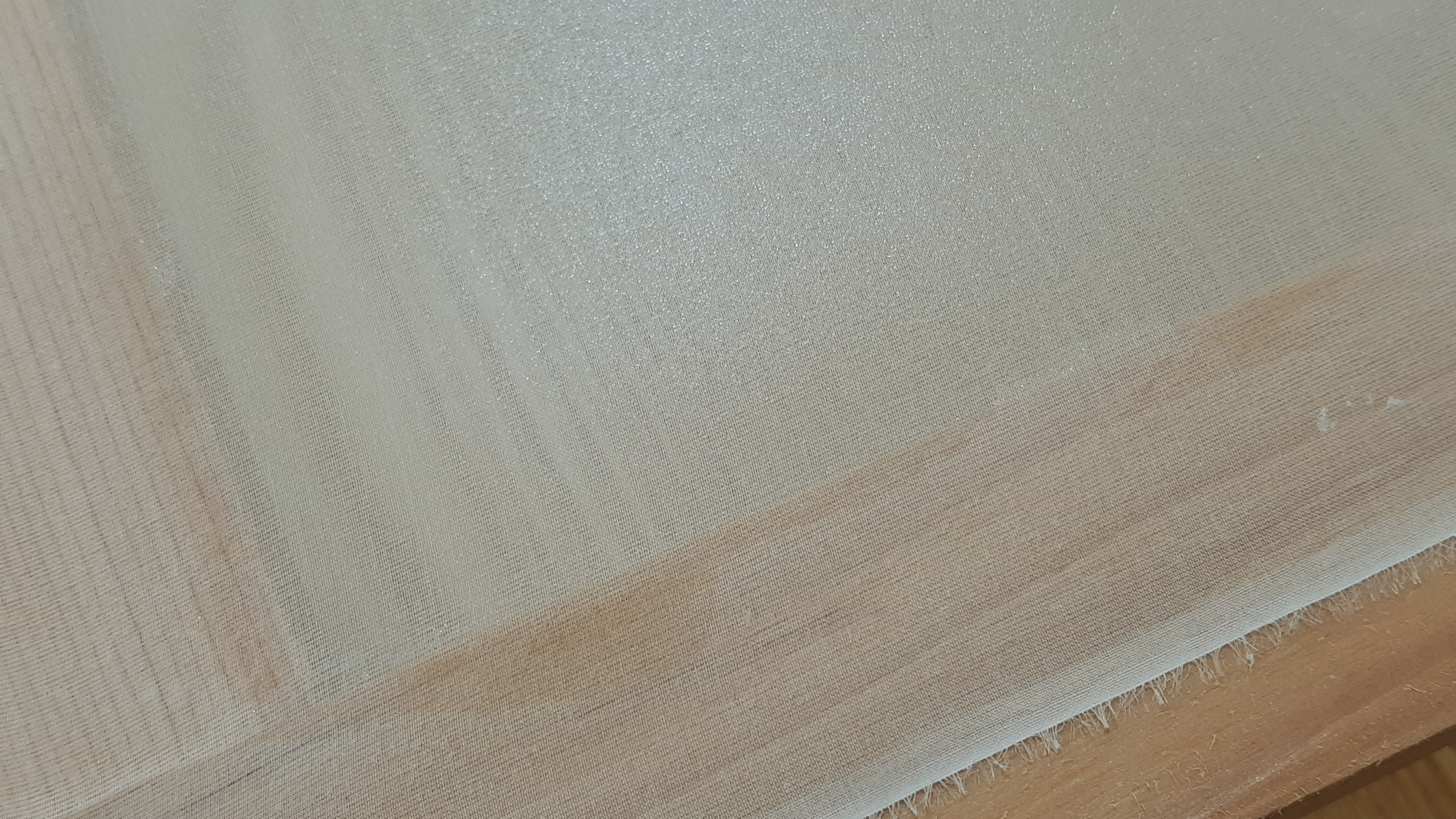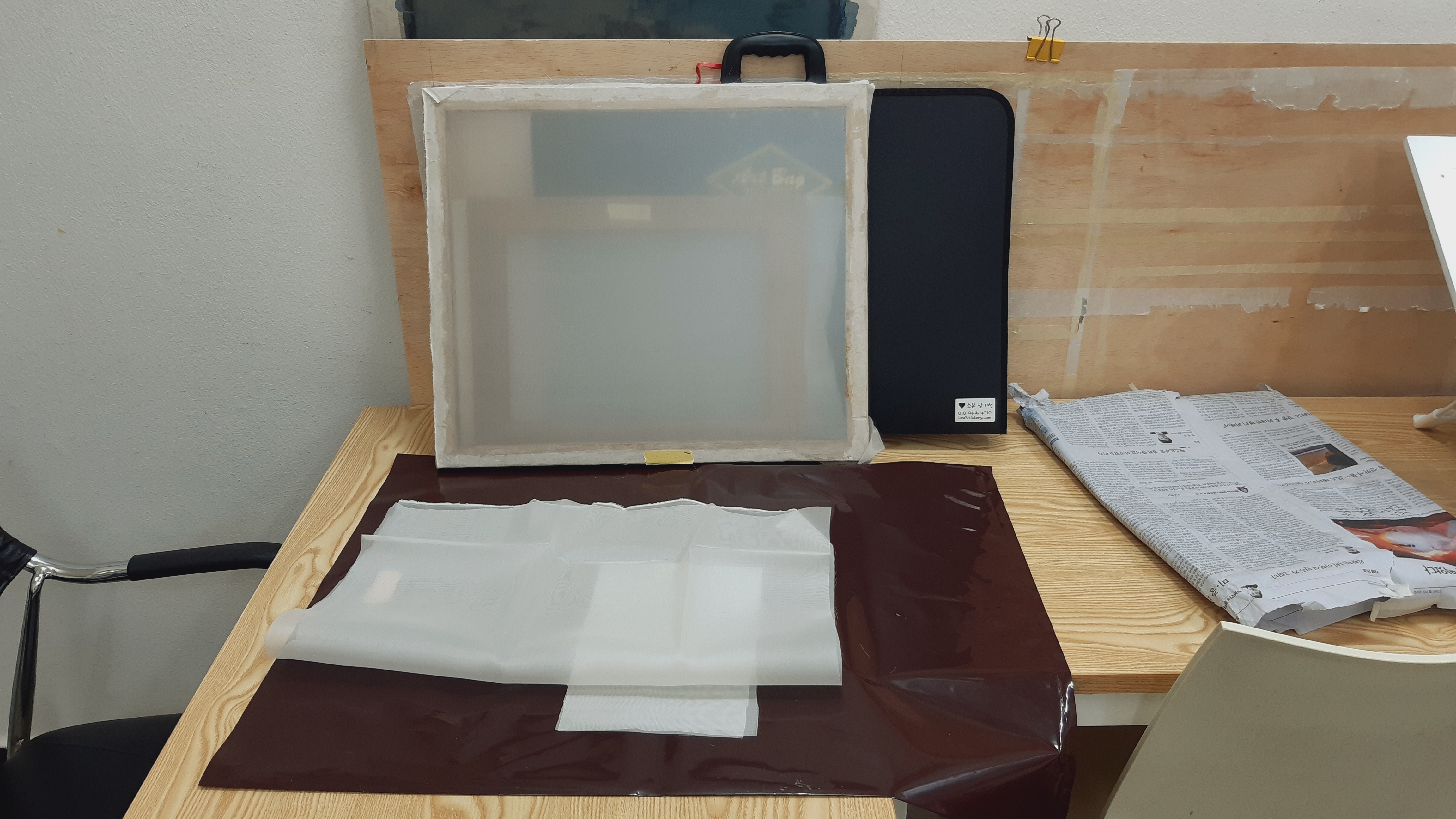 그러나 교반수를 칠할 때 비단에 교반수가 스며들어가지 않고 걷도는 느낌, 미끈거리는 느낌으로 칠해지는 현상이 발생했습니다. 그리고 솔질을 할 때 교반수가 칠해지지 않는 '점' 부분이 많이 생겼습니다. 총 5회 아교포수를 하는데 매 번 같은 느낌이었습니다. 비단 수세가 잘 안된것으로 판단되었습니다.