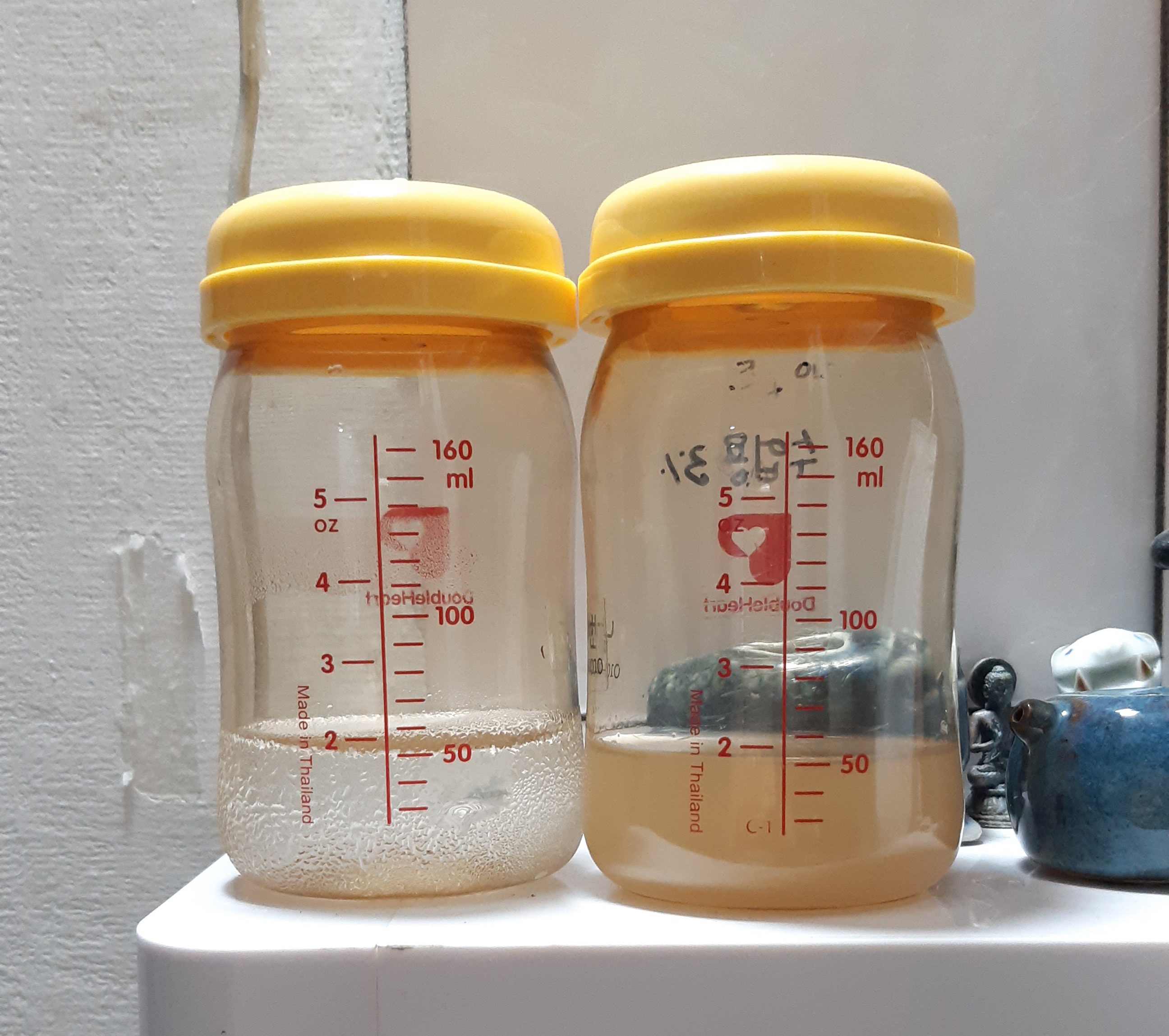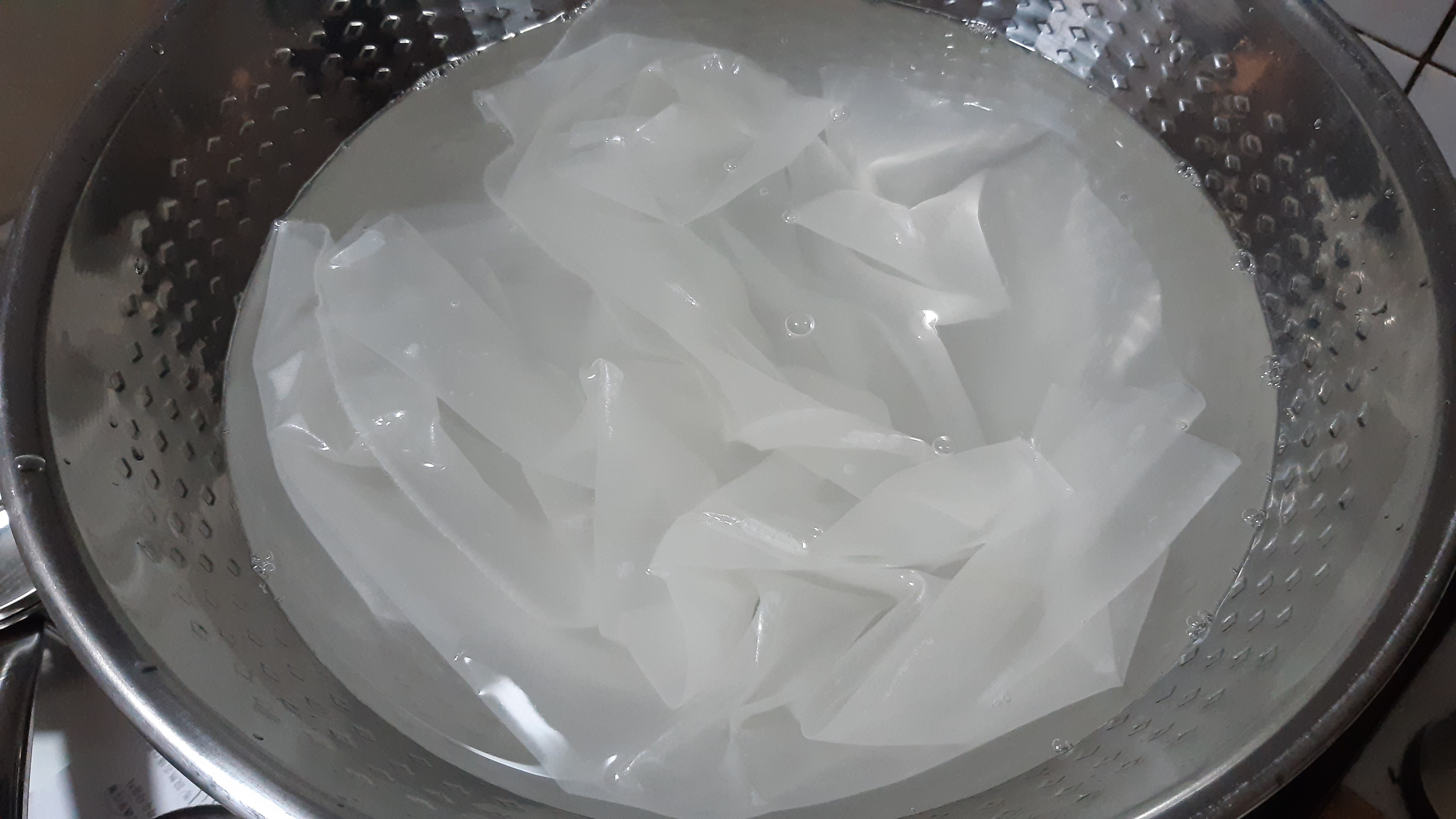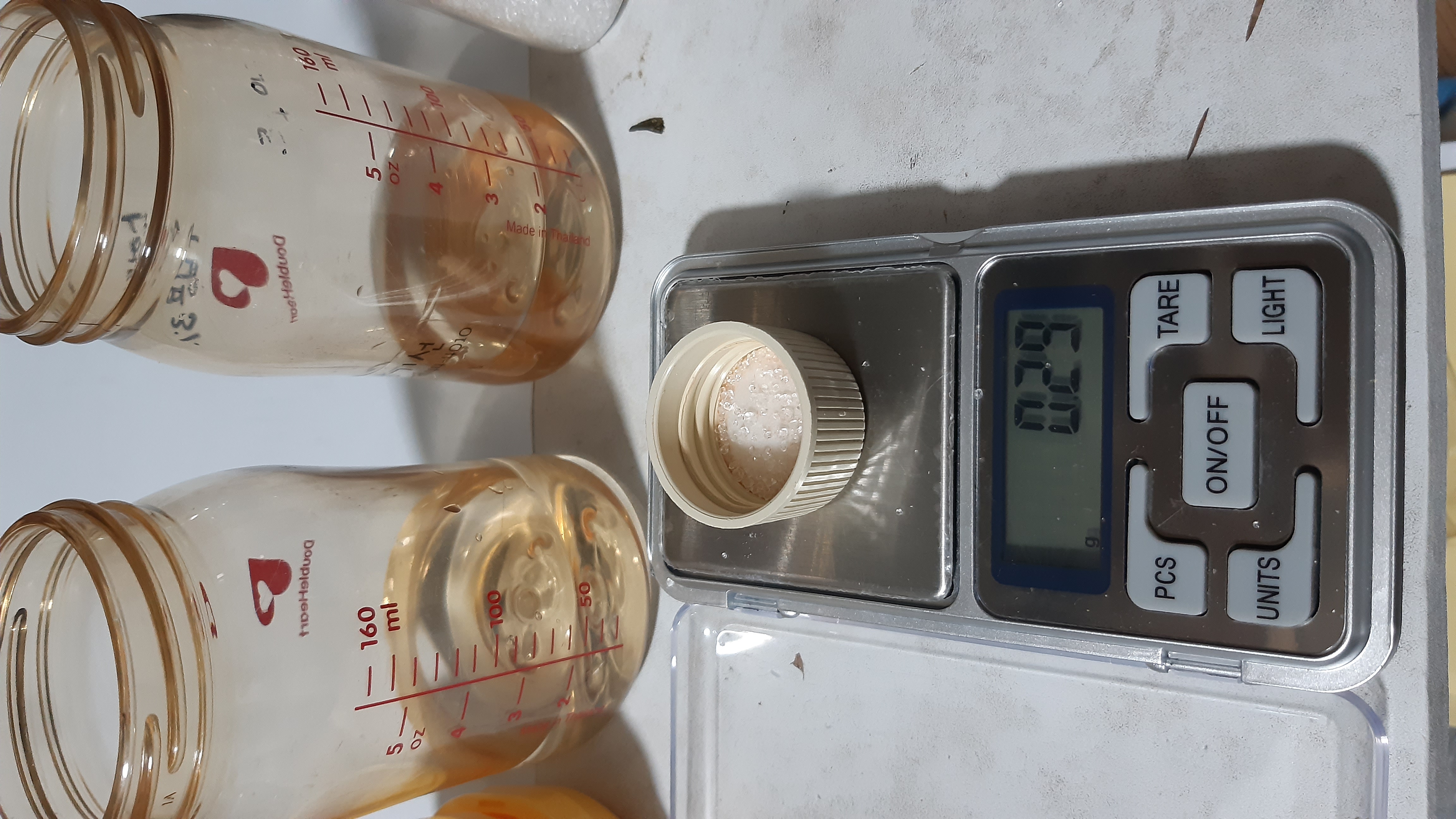 물 100g 을 두 병에 나누어 담고, 각 각 아교와 백반을 넣어 냉장고에서 하루 반을 불립니다.