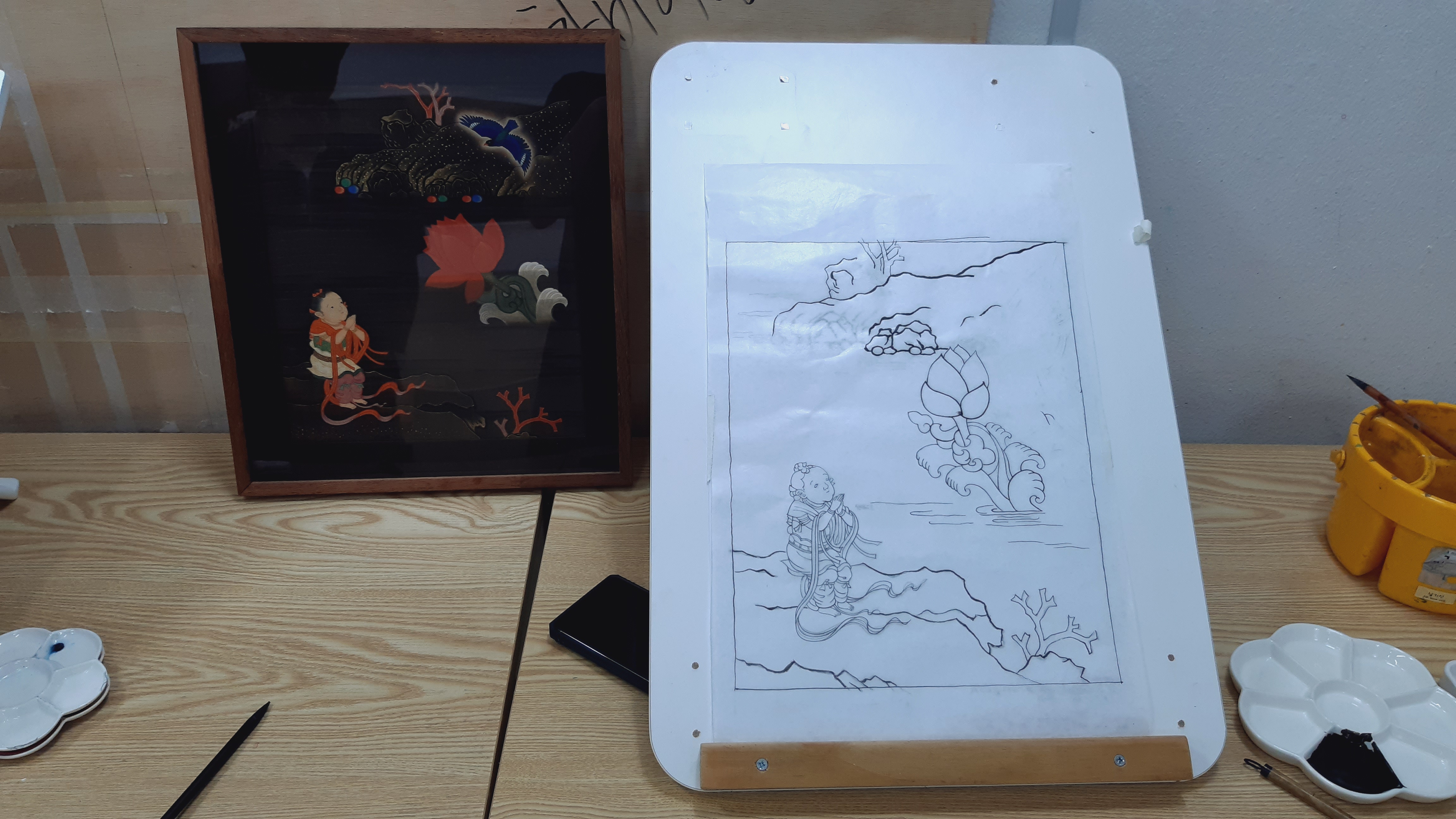5회에 끝나도록 교반수의 농도와 솔질의 방법을 달리합니다. 5회 칠하고 말리는 동안 먹선으로 초를 뜨는 연습을 충분히 합니다.