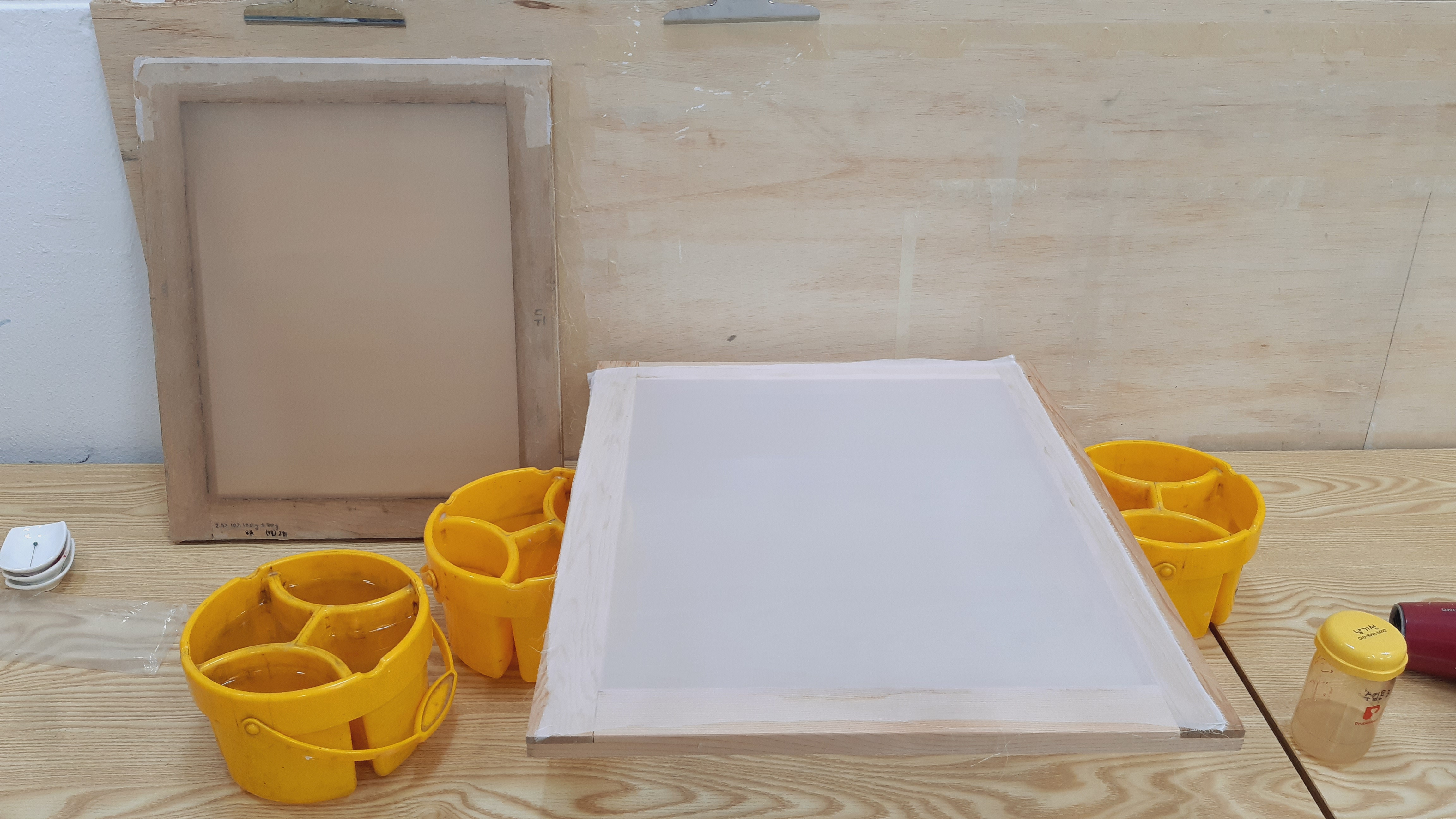 비단을 견틀에 붙이고 수세한 후 교반수를 칠합니다.