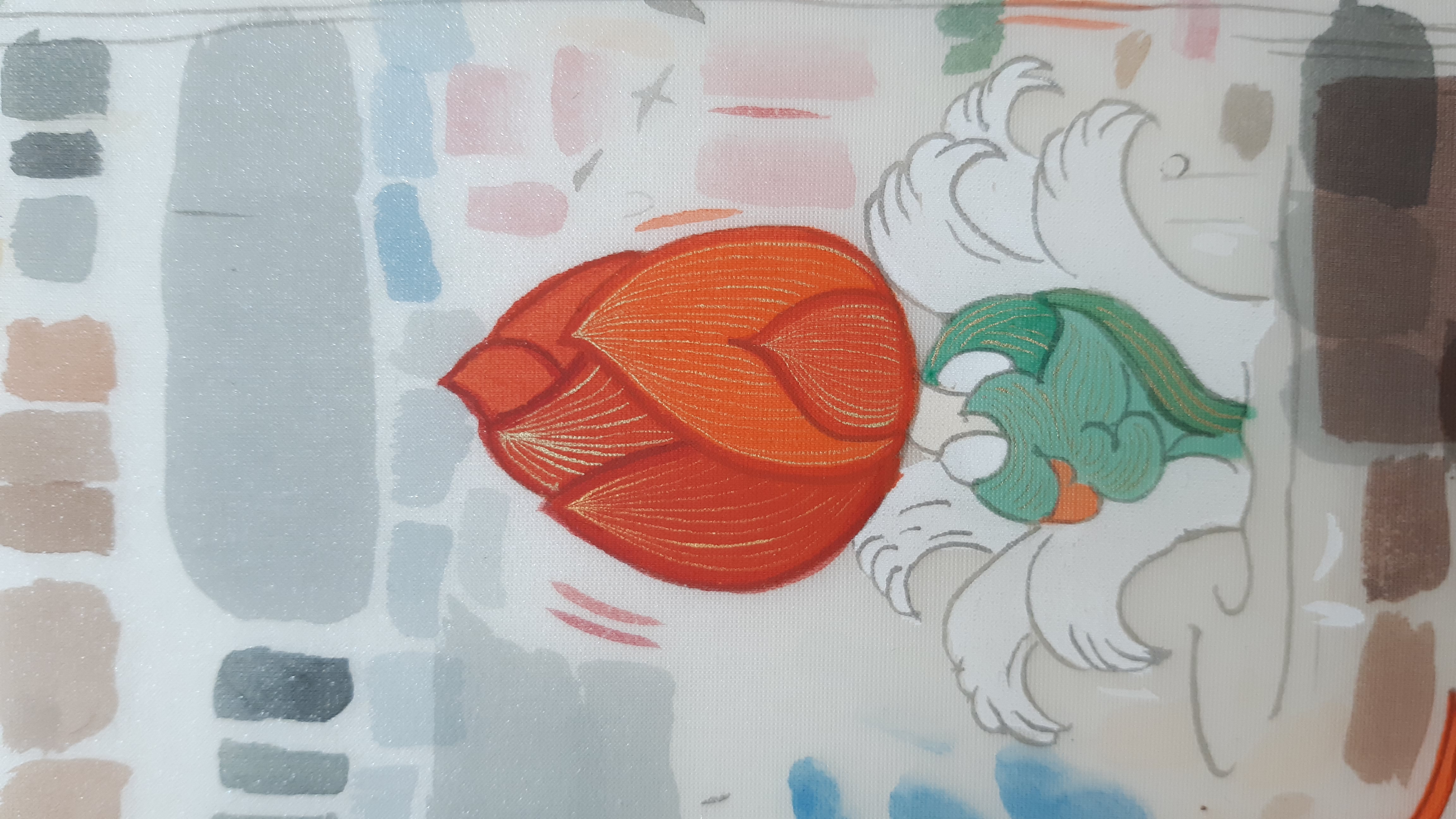 연꽃에 금선을 긋는 작업은 선의 방향과 선이 촘촘한 정도가 초보자로서는 쉽지 않기 때문에 충분한 연습을 하고 긋습니다. 새로 그린 연봉우리에 맞는 선의 방향을 찾으려면, 다른 수월관음도의 연봉우리를 여러장 찾아보고 공부해야 합니다.
