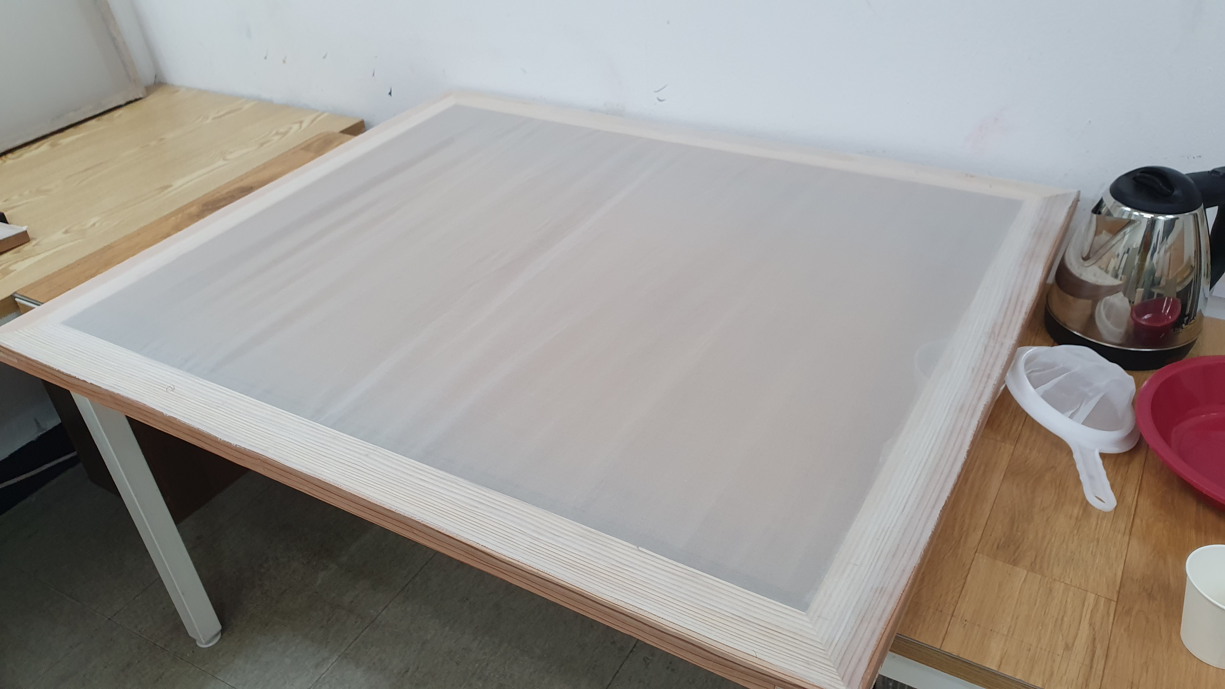 교반수를 다 칠하면 틀이 휘어질 정도로 비단이 당겨지게 됩니다. 큰 틀의 경우 나무는 가운데 부분이 1cm 정도 안쪽으로 당겨집니다.