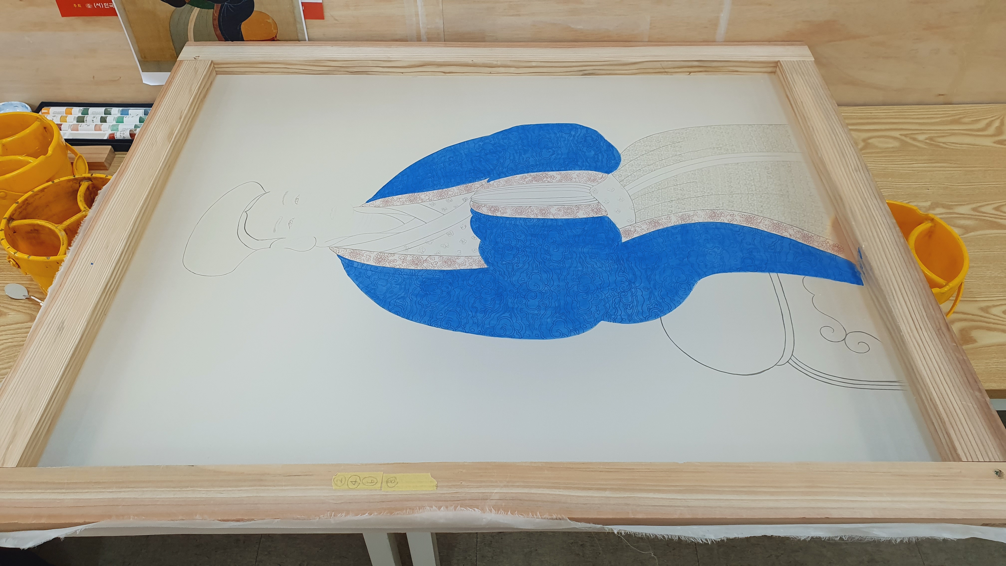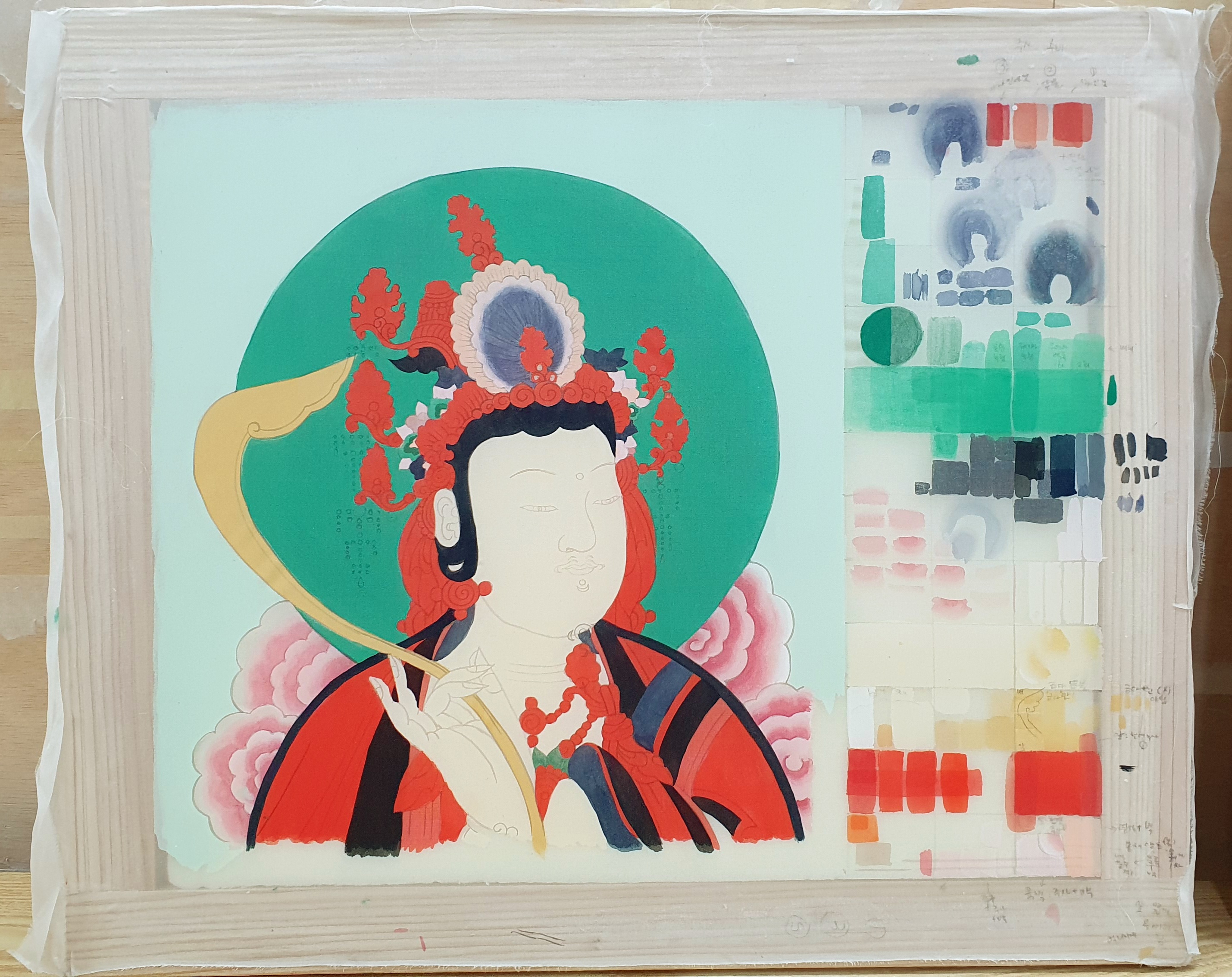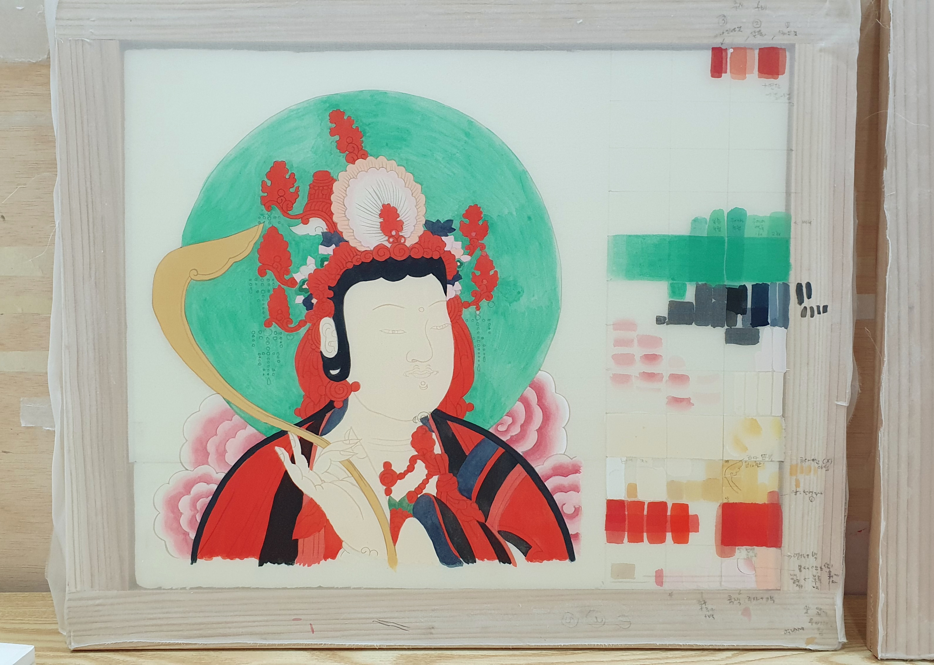 같은 비단에 색표를 만들어서 충분히 테스트 하고 물감과 채색 방법을 선택합니다.